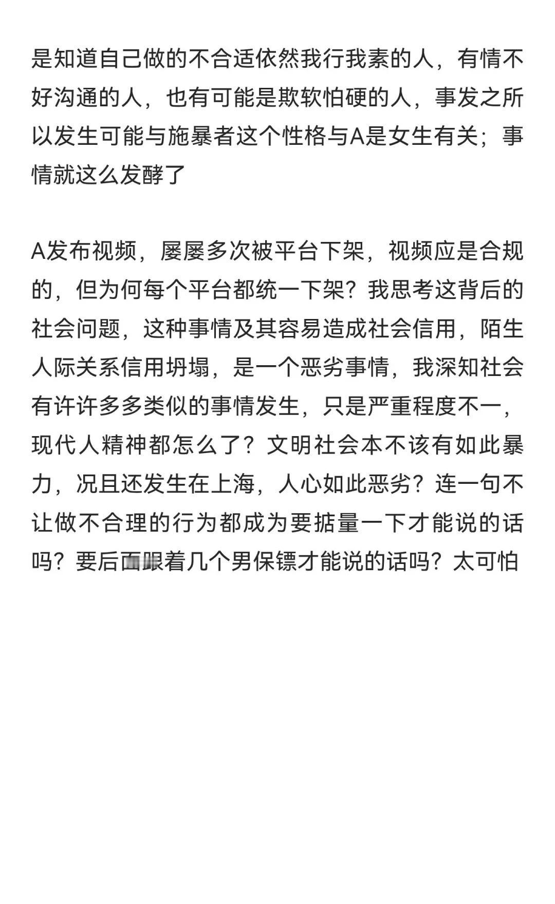 公共事件 因为受害者表妹在领居家隔壁租了房子,门口外面楼梯旁边堆放了领居家很多杂物,有厨余外卖垃圾,汤汁撒到外面,造成公共环境的污染,受害者A替表妹敲门,让领居家不要把垃圾放门口,随后领居一个老头先动手推几把A,A说要报警,结果引来更深暴力,领居老头儿子把A拉到角落,并实施长达2分钟的暴力,邻居一家老小聚众打人 ,A表妹报警A住院,这整个过程,我想知道这个事件打人者该怎么判?全程门口都有监控记录下来了,然而领居还污蔑是A先打人,引来的人也指控是A,实际上并非A打人,有证据;A是我关注的博主叫一卷民谣,她不敢相信21世纪还有这种事情发生,她应该精神受到创伤,事发后半个月没有工作了;这个事情带来的启示是什么?我觉得一个人能把垃圾放公共区占用并制造污染的行为,本身是没素质或者没有意识到问题的人,然而大概率都是知道自己做的不合适依然我行我素的人,有情不好沟通的人,也有可能是欺软怕硬的人,事发之所以发生可能与施暴者这个性格与A是女生有关;事情就这么发酵了 A发布视频,屡屡多次被平台下架,视频应是合规的,但为何每个平台都统一下架?我思考这背后的社会问题,这种事情及其容易造成社会信用,陌生人际关系信用坍塌,是一个恶劣事情,我深知社会有许许多多类似的事情发生,只是严重程度不一,现代人精神都怎么了?文明社会本不该有如此暴力,况且还发生在上海,人心如此恶劣?连一句不让做不合理的行为都成为要掂量一下才能说的话吗?要后面跟着几个男保镖才能说的话吗?太可怕 @一卷民谣 自由平等公正法治 坚决打击犯罪 社会责任感 公道自在人心 保护自己的利益保护女性 弱势群体 公平正义