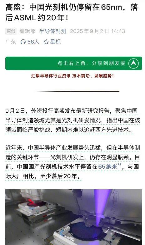 [微风]高盛:中国光刻机制程还停留在65纳米,落后西方20年! 啧啧啧,都落后20年了,你们怕啥呢? 说白了,他们骨子里还是想躺着赚钱,但现实情况却是,这种想法已经不存在了。 因为中国在光刻机领域发展的飞快。 说白了,那种习惯了技术领先就能“躺着赚钱”的好日子,可能真的要一去不复返了,因为现实的剧本,正在被加速改写。 把65纳米这个数字当成中国光刻机的全部,就像看一本书只读了序言就妄下结论。这确实反映了一个阶段的现实,但它却巧妙地忽略了发展的加速度。 就在许多人还在为这个数字扼腕叹息时,上海微电子装备(SMEE)的28纳米浸没式光刻机已经进入了最后的冲刺阶段。 别小看从65纳米到28纳米这一步,这可不是简单的数字游戏。它意味着中国将有能力自主生产覆盖全球70%以上市场需求的成熟制程芯片,从汽车电子到物联网,从工业控制到消费类产品,这些领域才是支撑起整个数字世界的基石。 当别人还在争论EUV光刻机什么时候能造出来时,中国已经选择了一条更务实的路:先把最广阔的阵地牢牢掌握在自己手里。这步棋,看似慢,实则稳。 更有意思的是,当所有人都把目光聚焦在“光刻机”这一条赛道上时,中国正在悄悄地修建另一条高速公路。这条路叫“先进封装”,或者更通俗点说,“ Chiplet”(小芯片)技术。 既然单颗芯片的制程暂时追不上,那能不能用两颗、甚至多颗成熟制程的芯片,通过高超的封装技术“粘”在一起,实现一颗先进制程芯片的性能呢?华为已经用行动给出了答案。 他们通过将两颗7纳米芯片进行堆叠,实现了接近14纳米芯片的性能,成功绕开了最锋利的EUV封锁。长江存储的Xtacking技术,也是异曲同工之妙,在存储芯片领域开辟了新天地。 这种“换道超车”的思路,彻底打破了“唯制程论”的传统游戏规则。当领先者还在加固自己赛道上的壁垒时,追赶者已经开着越野车,在旁边开辟出了一条全新的路。 如果再把视线拉远一些,你会发现一个更庞大的体系正在悄然成型。一台光刻机,号称“现代工业皇冠上的明珠”,它背后是超过十万精密零件的集合,是光学、材料、化学、精密控制等无数学科的极限挑战。过去,我们总说被“卡脖子”,其实被卡的不是一个点,而是一整条产业链。 但现在,情况正在起变化。从光刻机最核心的光学镜头,到决定成像质量的“光刻胶”,再到各种高纯度的特种气体,一个个曾经被国外巨头垄断的领域,都开始出现了中国企业的身影。 比如长春国科,已经能够提供光刻机所需的高精度光学系统。这背后是海量的资金和人才,像潮水一样涌向这个曾经看似遥不可及的领域。这不再是某个企业单打独斗,而是一场由上至下,遍布整个产业链的“总动员”。 为什么会有如此迅猛的变化?答案或许就藏在那些外部的压力里。当“实体清单”和“技术封锁”成为悬在头顶的达摩克利斯之剑时,生存的本能被彻底激发。 这不再是简单的商业竞争,而是关乎一个国家产业安全和未来发展空间的“上甘岭”。那种“造不如买,买不如租”的幻想被彻底击碎,取而代之的是一种破釜沉舟的决心。 所谓的“新型举国体制”,在这里体现得淋漓尽致,它不是简单的计划经济指令,而是将国家战略、市场需求、科研攻关和资本力量拧成一股绳,向着同一个目标精准发力。这种力量一旦形成,其爆发出的能量是任何单一企业或市场行为都无法比拟的。 所以,回到最初的问题,落后20年,到底怕不怕?或许,这个问题本身就问错了。当竞争的模式已经从百米冲刺变成了铁人三项,你还在用百米冲刺的成绩去评判一个铁人三项选手,这本身就是一种认知上的滞后。 高盛的报告,更像是一张过时的旧地图,它标出了过去的洼地,却没有画出正在隆起的新山脉。西方世界那种依靠技术代差就能轻松收割全球利润的时代,其根基正在被瓦解。因为对手不再遵循你制定的规则,他不仅在努力追赶,更在尝试重新定义游戏本身。 这场围绕光刻机的博弈,早已超越了技术本身,演变成一场关于战略、毅力和想象力的较量。当追赶者不再仰望星空,而是低头铺路,甚至开始修建自己的高速公路时,领先者是否还能安稳地躺在功劳簿上?这或许才是当下最值得思考的问题。对于这场波澜壮阔的产业追赶,你又看到了什么?