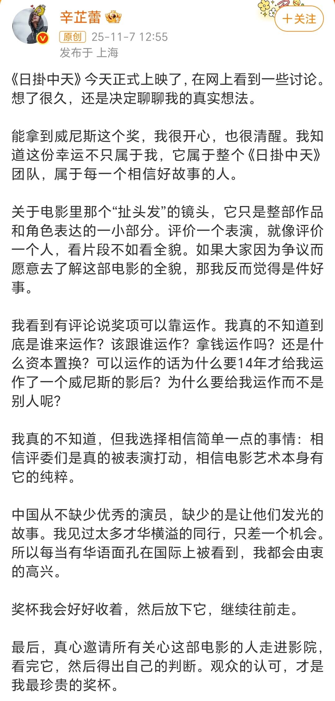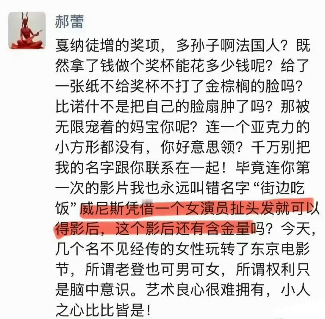郝蕾下场撕?这届东京电影节的闹剧,炸出了多少意难平? 网络流传一张截图,据说是郝蕾的朋友圈,她炮火大开,讽刺了圈内同行和各大电影节。 是路见不平一声吼,还是为自己演技在线却拿不到奖意难平,见仁见智! 演员拿奖这件事,得靠天时地利人和,要有演技有好作品还得恰好被不同评委肯定,是各种机缘凑成的幸事,并非演技上乘就可以,有运气成分加持。 相比而言,辛芷蕾的回应很显格局,她的文字一向清爽利落又言之有物。 不知道截图是否郝蕾所发,不过,辛芷蕾的回应好像印证了事情的真实性。 其实,影视圈不要撕来撕去了,电影院已经没有观众了,这难道不是更应该关注的事情吗?