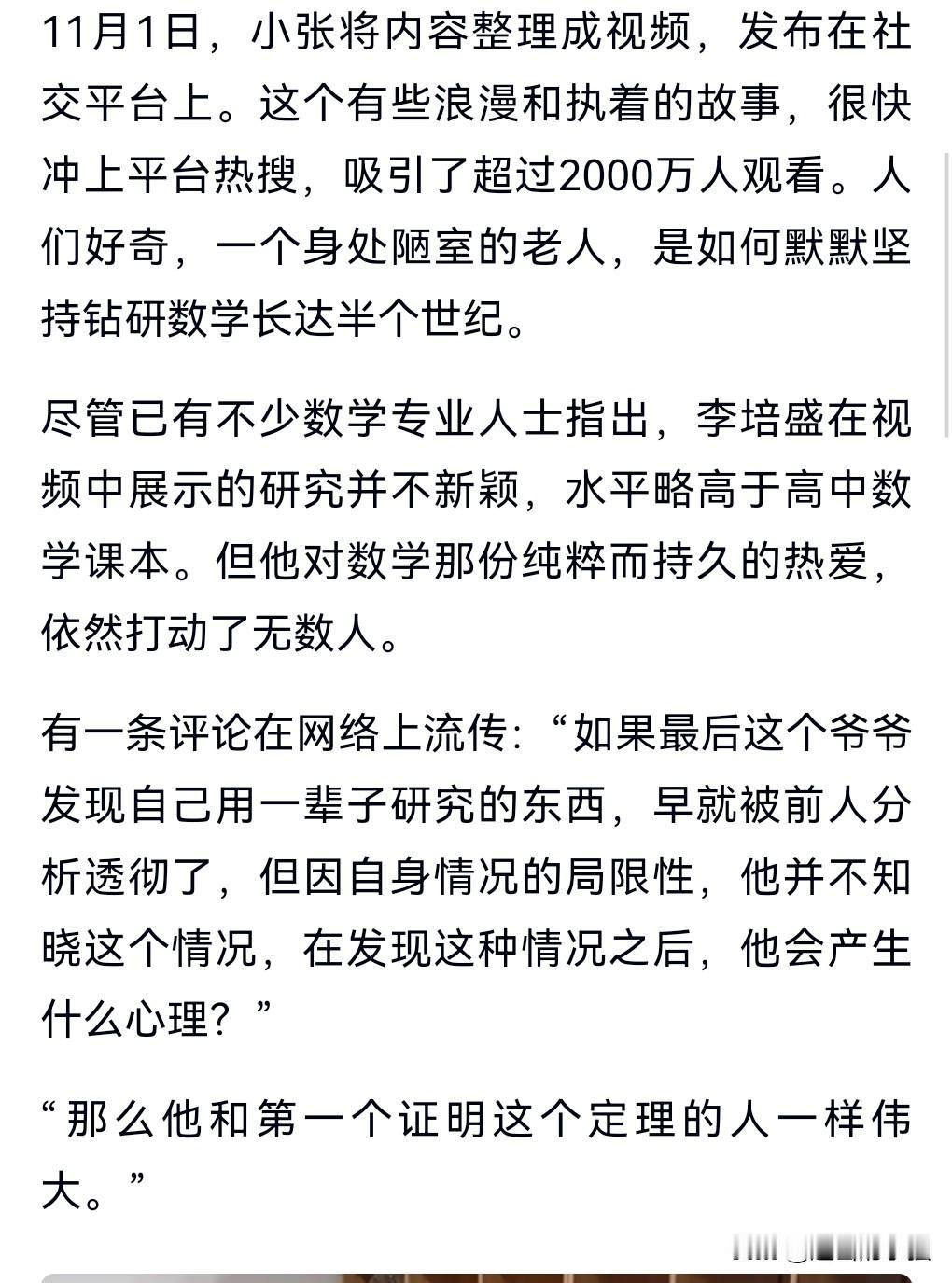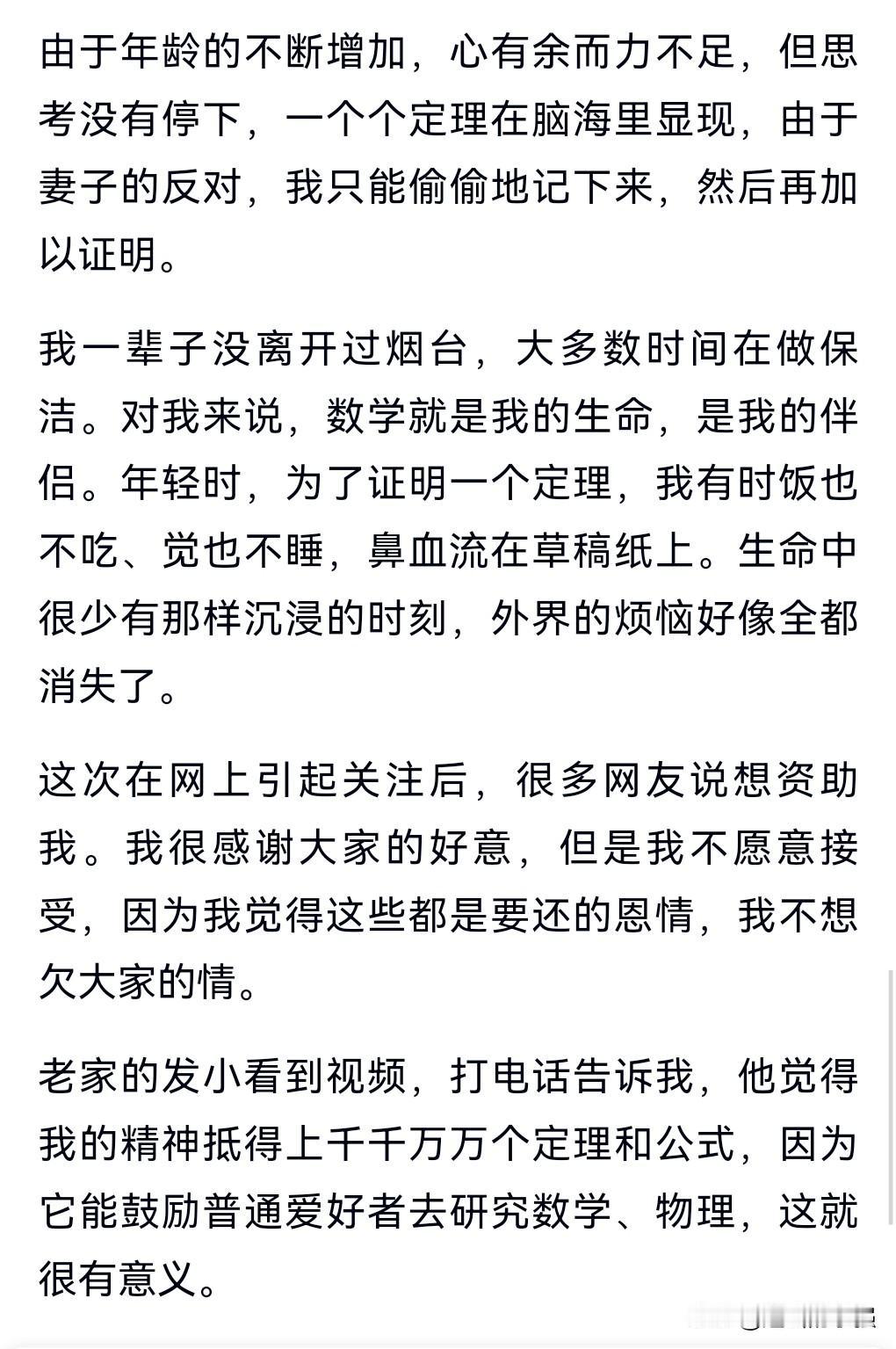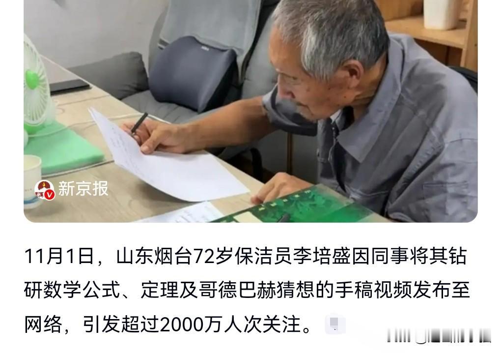 有梦想谁都了不起,一个人有一个自己的爱好,哪怕不被别人理解,那也是乐在其中的。 一个年过七旬的保洁员研究了几十年的数学,虽然他的水平不高,也就是略高于高中的数学课本。 但他的这种精神值得让我们学习,有一个自己的爱好,能够坚持一辈子,这足以是一件让人肯定的事情。 有人上传了他的视频,当时就引发了超2000万人的关注。 他甚至还研究哥德巴赫猜想。 当然了,我认为他研究不明白,但是他这种热爱学习的精神就值得肯定。