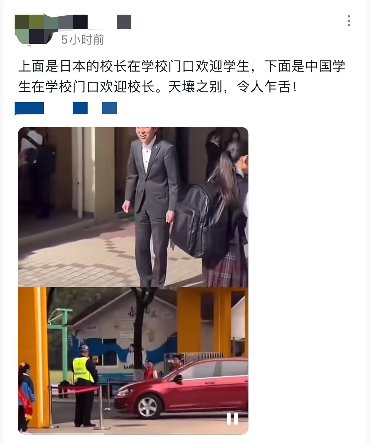 对日本充满敬意的吹子终究是没放过这次机会,杭州一小学学生校门口“礼迎”开车老师,吹子立即把日本校长给学生点头哈腰的画面拿出来对比,想以此证明日本的礼仪有多先进。杭州小学错在没有足够尊重学生,如果是给走路进门的老师敬礼,老师也礼貌回礼就没什么问题。尊师重道本身没错,但要互相尊重,开着车进门不搭理学生不对,但让老师或校长卑躬屈膝迎接学生也是馊主意。