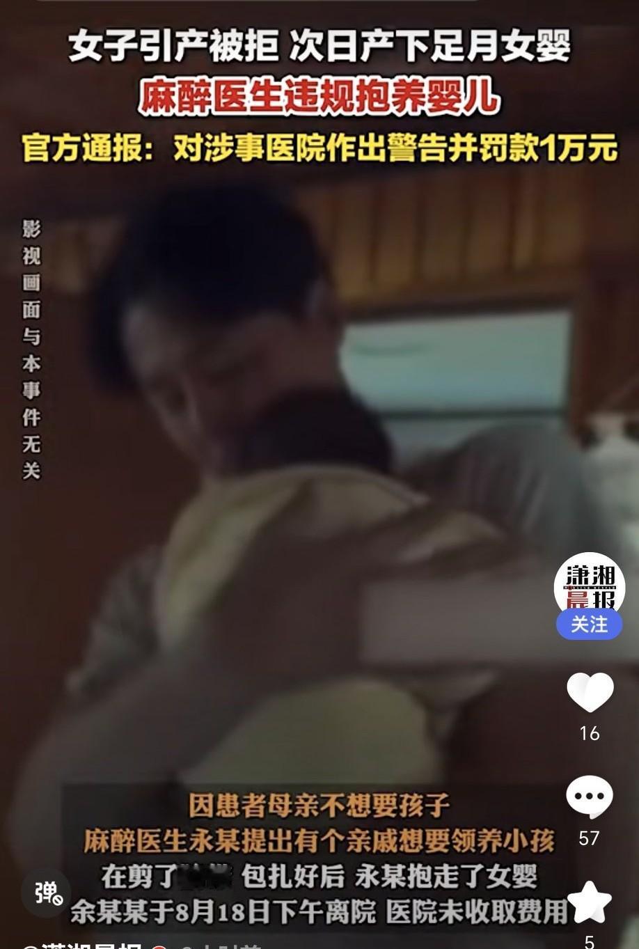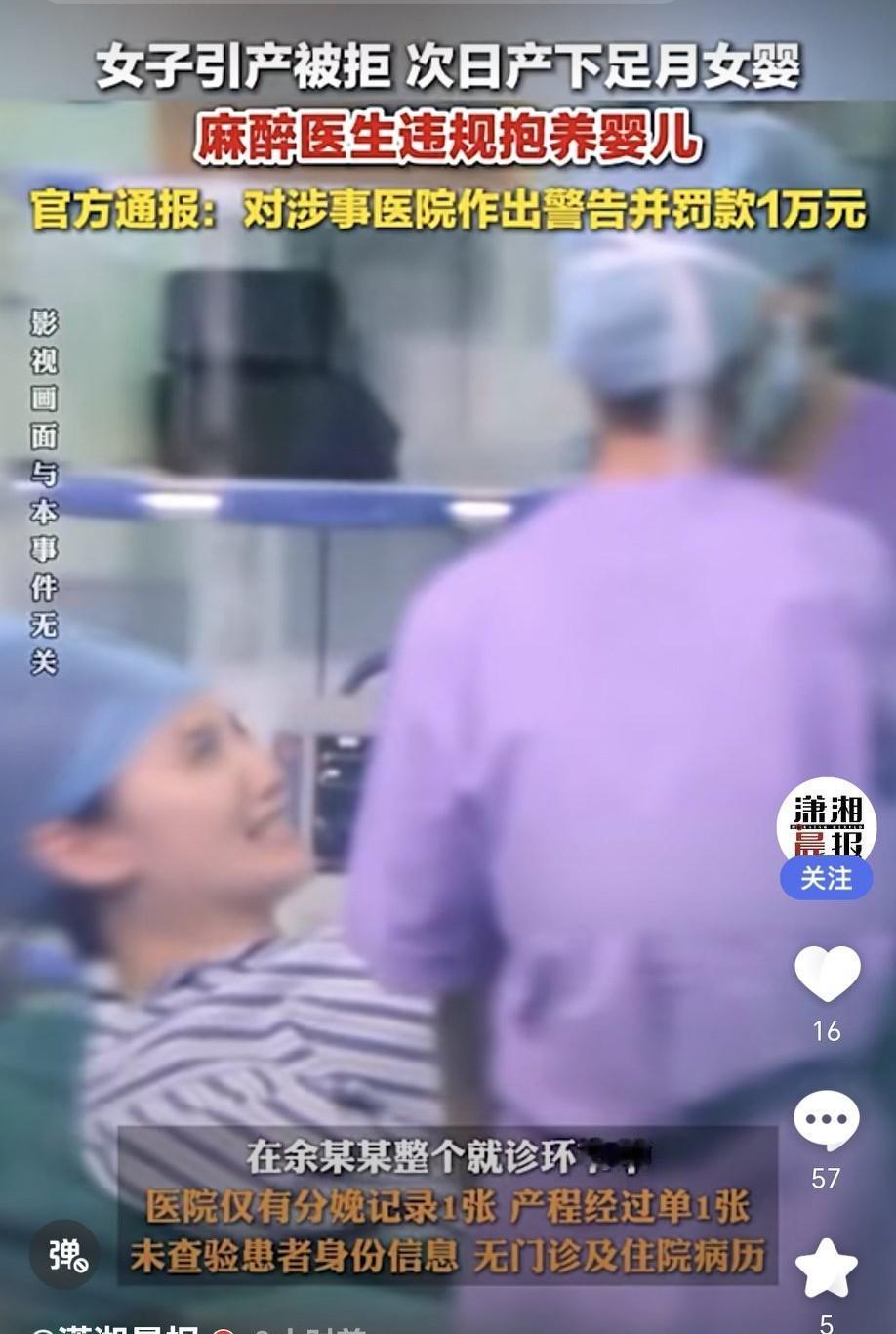 云南迪庆州一女子引产被拒,诞下女婴被医生抱养。官方通报:对涉事医院作出警告并罚款1万元。8月16日患者余某某去香格里拉民生医院引产被拒后留院,次日生下女婴。因母亲不愿养,麻醉医生永某称亲戚想领养就抱走孩子,患者离院还没被收费。 这医院问题一堆,诊疗时不查验患者身份信息,就一张分娩记录和产程经过单,没按规定建门诊及住院病历,也不落实首诊负责、查对制度,还不履行侵害未成年人案件强制报告义务。11月5日,卫健委对医院作出警告并罚款1万元。 A网友:孕妇咋想的,都足月了还想引产,这和杀人有什么区别?这医院也太敷衍了吧?余某整个就诊环节,仅有分娩记录单一张,产程经过单一张,连患者身份信息,门诊及住院病历都没有。 B网友:身为一名医务人员,不知道怎么去评价,一面是人性,一面是法律,当你面对一个连这个世界都没看一眼的小生命时,你要亲手解决或者叫处理掉他时,那是会遭报应的。 先不说女子,医生虽然是好心,但肯定是违法的,因为领养孩子有程序的,医生既然想要孩子,可以将孩子安置抚养室,同时第一时间申请领养孩子走程序。领养孩子确实有必要申请走程序审核,不然谁知道你领养孩子的目的是什么,万一是坏人呢?甚至丧心病狂买卖器官呢?这样的事不是没有,甚至有老外在背后出资,专门以领养孩子的名义,拐走中国小孩,至于是真领养,还是为了其它邪恶私利,甚至是买卖器官等,谁知道呢?所以登记走程序审核,还是有必要的,至少减少一定的风险。 还有这医院,病人来了都不用走流程的吗?管理如此混乱,必须得好好整改,不然以后还不知道会出什么事情呢?大家觉得呢?