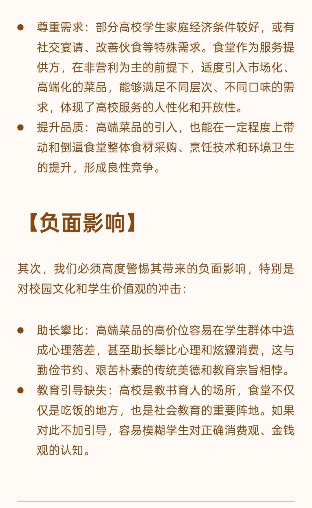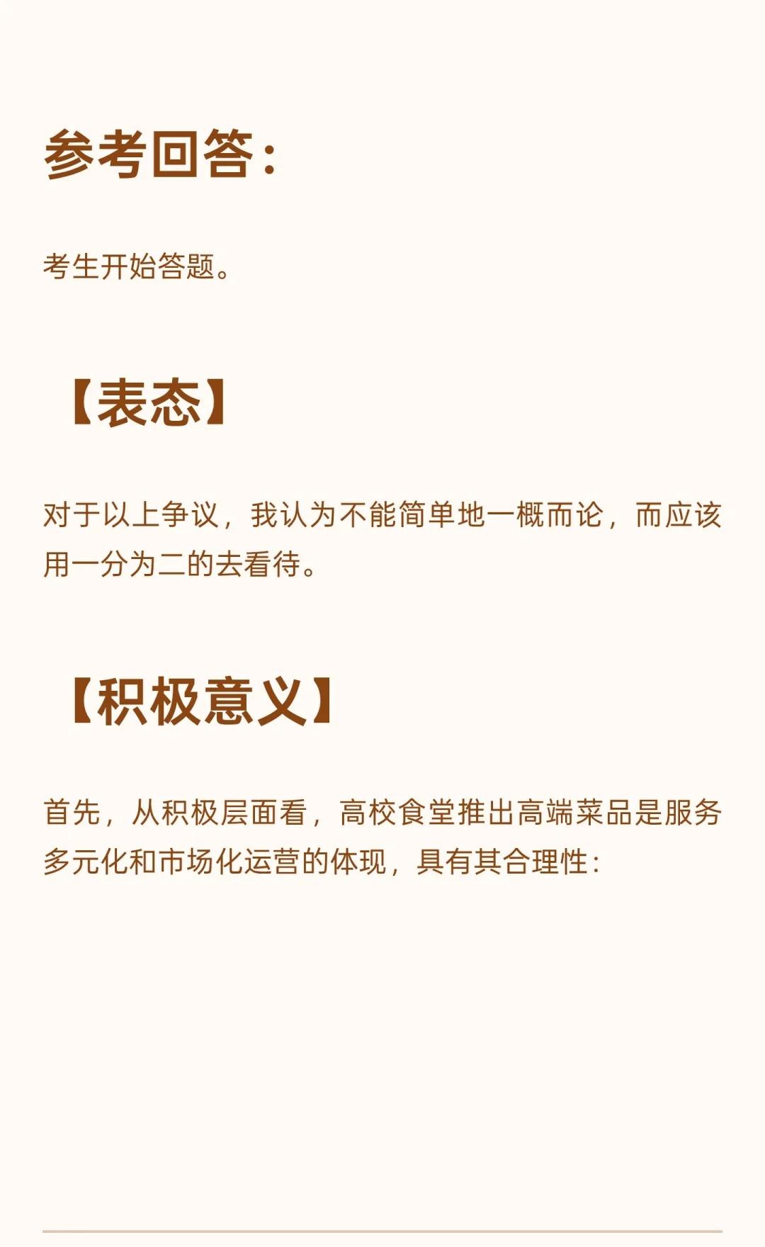 2026面试热点——南大食堂帝王蟹 模拟题目: 近日,某著名高校食堂推出售价较高的“帝王蟹”等高端菜品,引发了社会对高校餐饮服务、学生消费以及勤俭节约教育的广泛关注和讨论。有人认为这是高校服务多元化、尊重学生需求的体现;也有人担忧这会助长校园内的奢靡之风和攀比心理。对此,你怎么看? 参考回答: 考生开始答题。 【表态】 对于以上争议,我认为不能简单地一概而论,而应该用一分为二的去看待。 【积极意义】 首先,从积极层面看,高校食堂推出高端菜品是服务多元化和市场化运营的体现,具有其合理性: 尊重需求:部分高校学生家庭经济条件较好,或有社交宴请、改善伙食等特殊需求。食堂作为服务提供方,在非营利为主的前提下,适度引入市场化、高端化的菜品,能够满足不同层次、不同口味的需求,体现了高校服务的人性化和开放性。 提升品质:高端菜品的引入,也能在一定程度上带动和倒逼食堂整体食材采购、烹饪技术和环境卫生的提升,形成良性竞争。 【负面影响】 其次,我们必须高度警惕其带来的负面影响,特别是对校园文化和学生价值观的冲击: 助长攀比:高端菜品的高价位容易在学生群体中造成心理落差,甚至助长攀比心理和炫耀消费,这与勤俭节约、艰苦朴素的传统美德和教育宗旨相悖。 教育引导缺失:高校是教书育人的场所,食堂不仅仅是吃饭的地方,也是社会教育的重要阵地。如果对此不加引导,容易模糊学生对正确消费观、金钱观的认知。 【对策】 因此,我认为平衡之道在于“多元服务”与“正确引导”并重: 明确主责:食堂的首要定位是保障基本、平价、健康的餐饮供给,高端菜品只能作为补充和探索,绝不能挤占平价菜品的资源和空间。 消费引导:高校应加强对学生的消费观教育,倡导量力而行、适度消费,通过主题活动、宣传栏等形式,弘扬勤俭节约的传统美德。 信息公开:对于高端菜品,应公开定价依据和成本构成,消除社会对“暴利”的疑虑,确保合理透明。 【总结】 总而言之,高校食堂的服务创新值得肯定,但其发展必须回归到育人的本质。我们应在满足多元需求的同时,坚守教育的底线和导向,让食堂成为勤俭节约与健康消费的示范窗口。广东省考 热点 公考面试热点 公务员面试 事业单位面试 结构化面试 社会热点