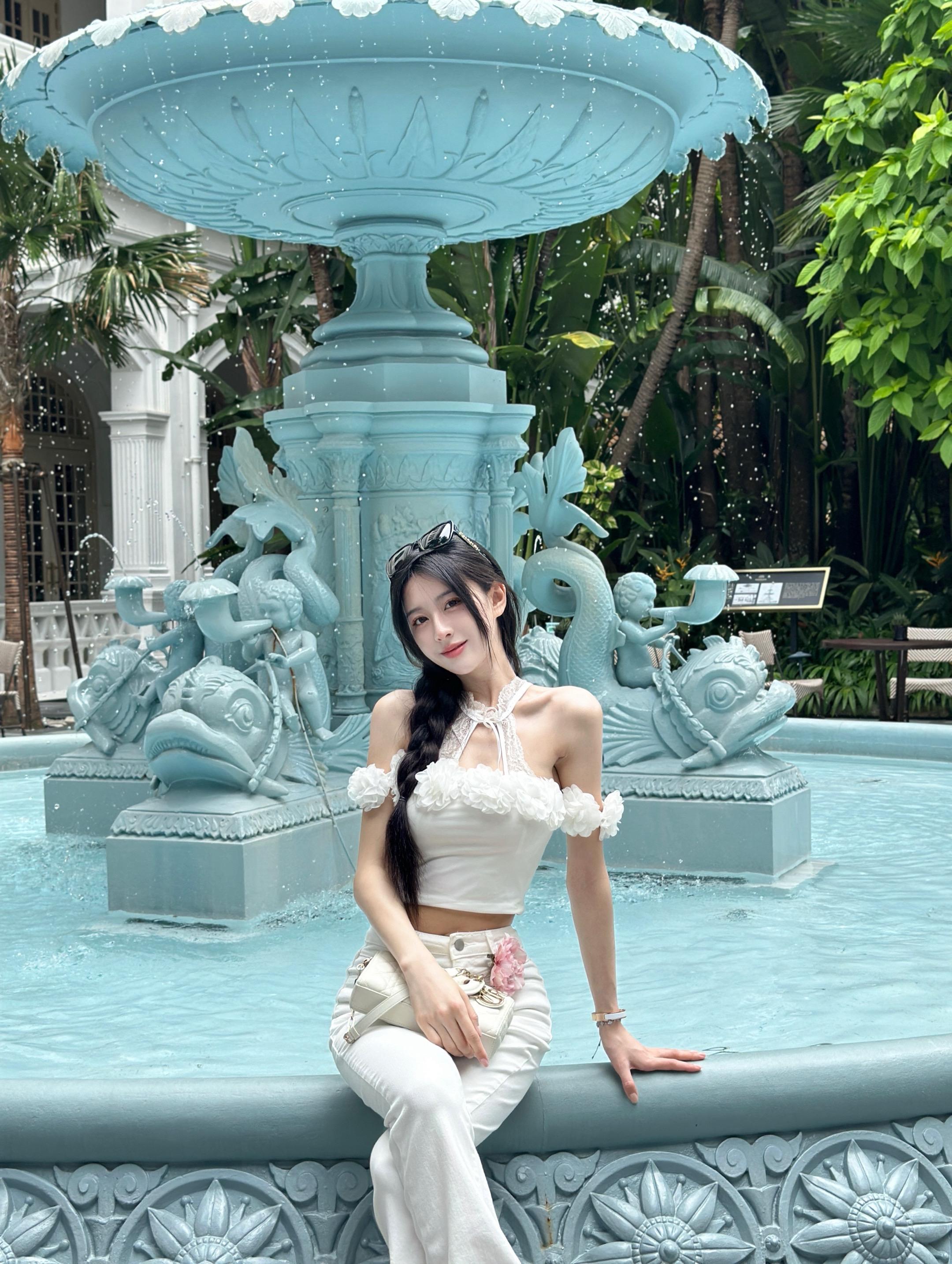 孙允珠都市时尚女孩穿搭指南,白色露肩上衣搭配黑色短裤和长靴,尽显优雅与自信!