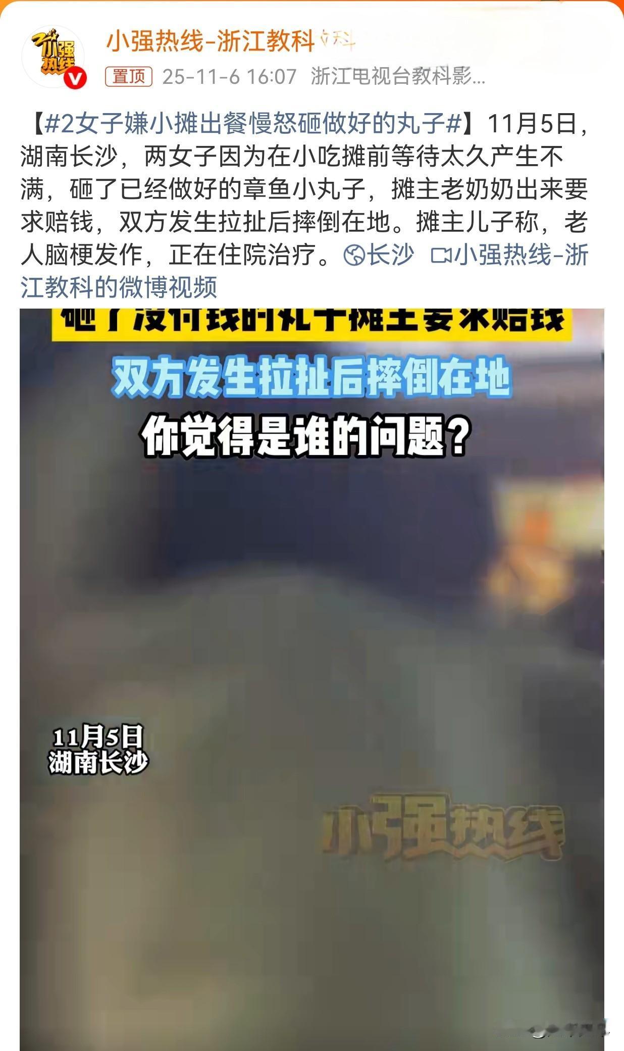 冲动是魔鬼,出了事就追悔莫及。生活都不易,且行且珍惜。 25年11月5日,湖南长沙大学城夜市,两名女子购买章鱼小丸子,因等待约15分钟心生不满。先砸了自己已付款的第一份丸子,后又砸了未付款的第二份丸子。摊主是位老奶奶,她要求赔偿未付款丸子的损失,双方发生争执。在拉扯过程中,黑衣女子推搡老奶奶导致她摔倒,之后老人突发脑梗送医。 根据围观群众的表述,摊主彭奶奶有高血压,平时得吃药,本来就想息事宁人,但看着自己做的丸子被糟践,忍不住从摊后走出来理论。没等她说两句,就被推了一把,彭奶奶没站稳,后脑勺“咚”地撞在摊位铁架上,下意识抓着对方胳膊想稳住,结果被狠狠一扯,直接摔在地上,黑衣女子还顺势压了上去,白衣女子则立马掏手机拍,但只拍彭奶奶抓人的画面,还说彭奶奶讹人。两名女子目前被传唤了,但是她们拒绝赔偿,认为不是自己的问题。 这个事件中这两名女子既有浪费粮食的问题更有推搡老人违法行为。砸没付钱不属于自己的丸子就肯定不合法了,摊主肯定有权索赔,因此发生争执导致老人脑梗发作,那就肯定要有责任了。如今造成严重后果却没有勇气敢于面对,更是让人哭笑不得。 看来她们俩在平时嚣张习惯了,承担点代价也许将来素质会提高一些!现实生活中和上了岁数老人发生争执,别说先动手,就是她追着踹我我都只能忍了。😝