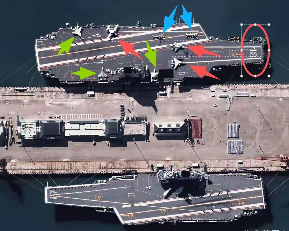 海南三亚军港内,17“山东”舰、18“福建”舰停泊在一个码头上,中国的“三航母”时代到来了,“福建”号航母舰艏的18编号清晰可见。 在“福建”号航母上,三个电磁弹射器起飞的弹射点上,分别停放着歼35T隐身舰载机、歼15T舰载机、“空警”600预警机。另外在航母甲板的不同位置上,还有三架型号相同的舰载机,不过“空警”600预警机的机翼处于折叠状态。而在航母斜角甲板的中前部,还有两架直20舰载直升机,一架应该是直20F反潜直升机,另一架是直20的舰载通用型号。 这就是目前“福建”号航母上,所有有人驾驶舰载机的型号配置,这次“福建”号的服役典礼中,没有出现舰载无人机的身影,也没有出现歼15D舰载电子战机。最后一句话,不出现、不代表没有,眼前的这些已经足够惊喜了。