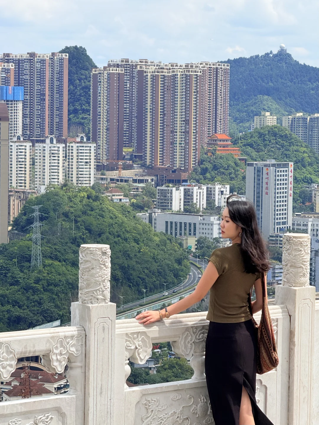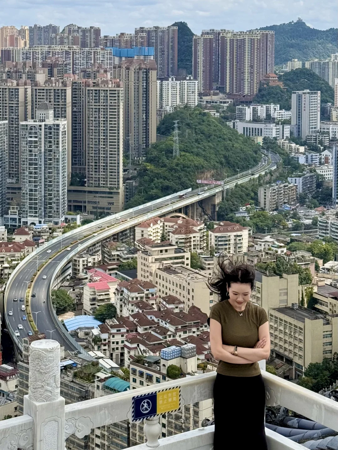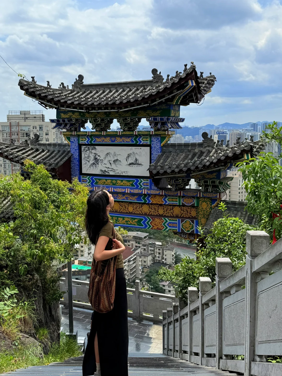 来贵阳不爬山是不可能的 但是这个不要钱!还可以俯瞰整个贵州的机位!! 真的巨巨巨好拍啊!!! · 打车到📍东山寺 走楼梯上去大概15min左右 拍照好看的机位都在财神殿附近 大家可以自行发掘一下 可以六点左右上去 既能拍到城市晚霞 多呆一会儿还能拍夜景 · 📸拍照小tips ✔️山上的风太大了,女孩子的头发建议扎起来 ✔️穿白色或者彩色的衣服会更出片,我的衣服跟城市背景有点融合了