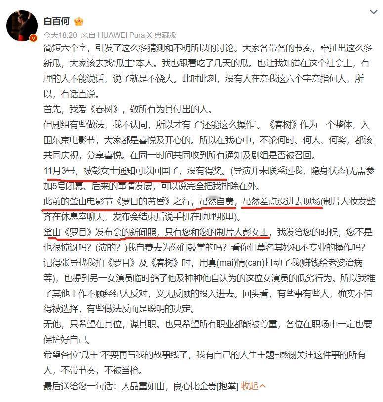 白百何回应了东京电影节的八卦! 其实就是她自己太把自己当自己人了,前段时间她甚至自费去了釜山电影节,但是去了之后差点没进入现场,人家女制片人说手机在助理哪里没看到她发的消息,这次东京电影节,人家也提前告诉她没得奖让她打道回府了,其实就是她和片方早有矛盾,也就这些电影节是作品入围,演员就自动入围,否则人家可能都不打算给她报奖,也不一定带她去。