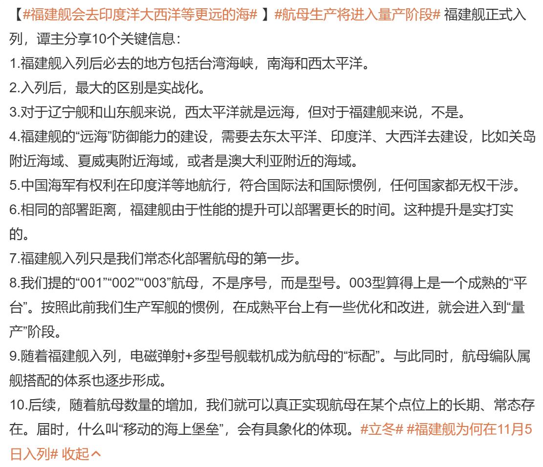 玉渊谭天列出的福建舰10个关键信息,其中有两个,特别值得注意。 一个是,第4和第5,福建舰将来活动的区域,是真正的远海,包括东太平洋、南太平洋,以及印度洋。 另一个是,福建舰属于003型,也就是成熟型,接下来就将进入量产阶段。 量产,玉渊潭天加了引号,因为毕竟是航母,不可能向驱逐舰一样,大批量建造,但是再建造个三艘左右应该不是问题。 最关键的是,这个“量产”还有一个意思,因为是成熟型,将来随着作战的需要,随时都可以进行大规模的批量建造。 这才是最关键,也是最厉害的。