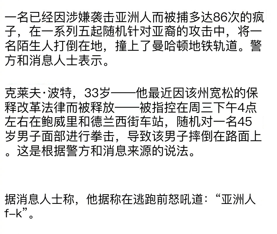 纽约一男子多次随机袭击亚裔。