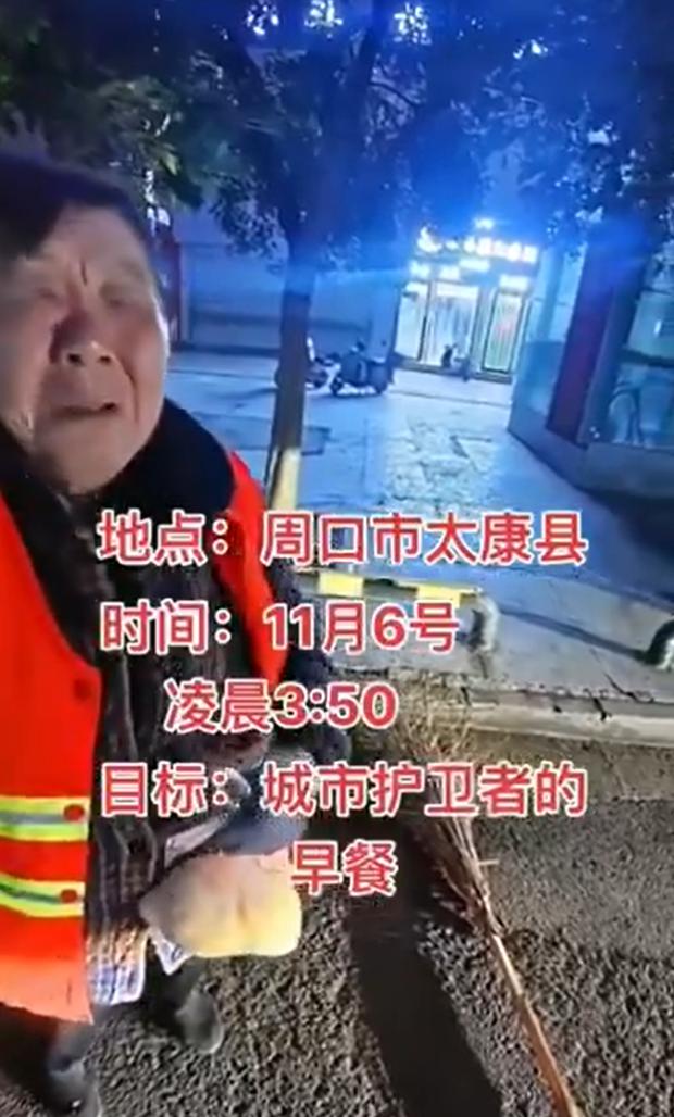 人间清晨最暖不在太阳 11月6日,河南省周口市太康县,一名博主清晨在街头为起早贪黑的环卫工人发放热腾腾的早餐。 视频中,环卫工们接过后连声道谢,其中一位环卫工奶奶接过早餐后感动到几度哽咽,含泪倾诉自己的境况。她说,自己凌晨两点便起床干活,刚与儿子吵过架,孩子从家里拿走了几万元积蓄。她哽咽地说,如今年纪大了,若哪天生病,连一点保障都没有。 看了一遍这个视频,我真看哭了,第一个老奶奶委屈的样子太让我动容了,同是老乡,谋生路才漂泊在外。我只希望这些年纪大的老人能有个和睦的家庭