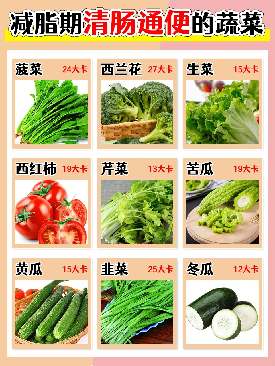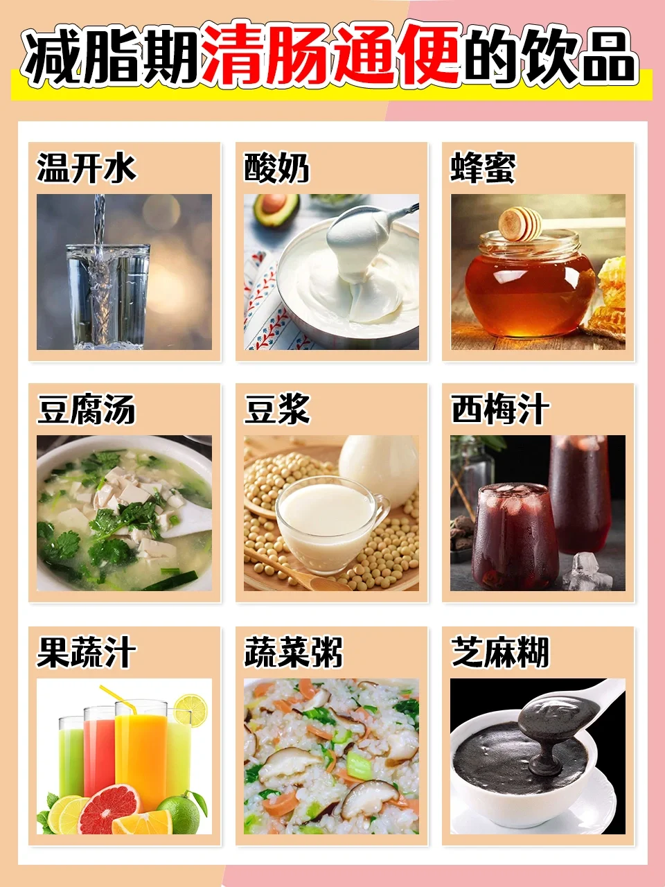 便秘对减脂人来说简直是噩梦般的存在‼️ 所以今天为大家整理了一些常见的清肠通便的食物 🌈蔬菜类: 菠菜、西兰花、生菜、西红柿🍅、芹菜、苦瓜、黄瓜🥒、韭菜、冬瓜 🌈水果类: 苹果🍎、香蕉、火龙果、猕猴桃🥝、梨、木瓜、圣女果、柚子、草莓🍓 🌈粗粮类: 糙米、玉米、红薯、莲藕、芋头、燕麦、玉米碴、红豆、荞麦 🌈新品类: 温开水、酸奶、蜂蜜、豆腐汤、豆浆、西梅汁、果蔬汁、蔬菜粥、芝麻糊 经常吃这些食物,刮油清肠又通便[赞R][赞R][赞R]