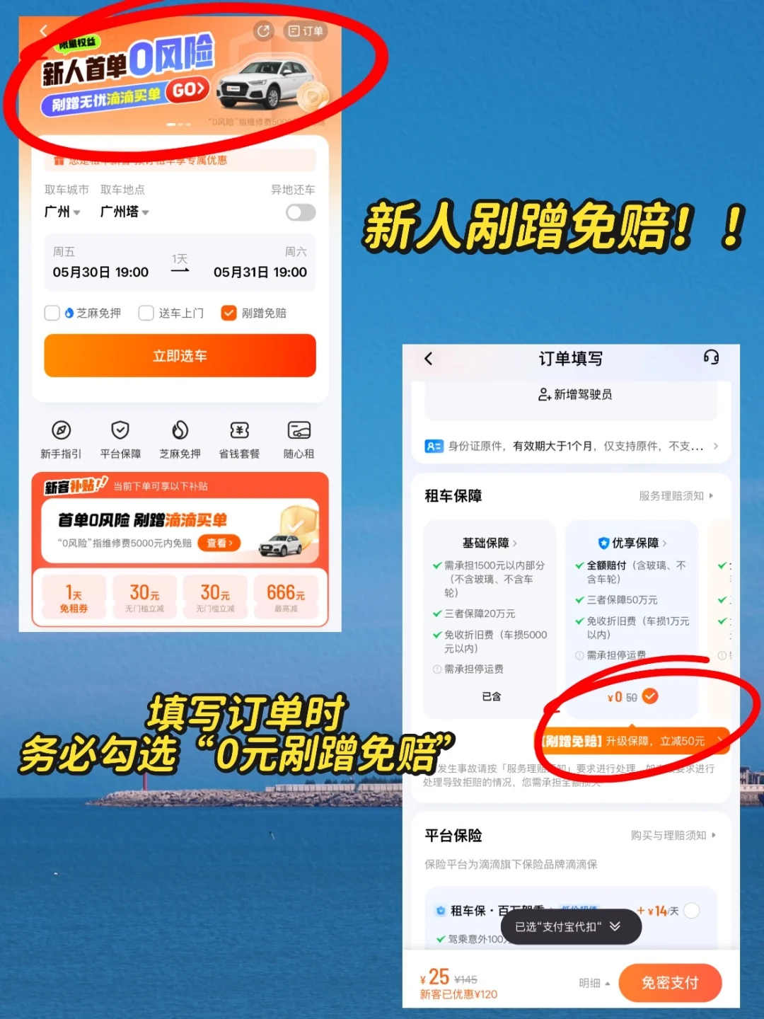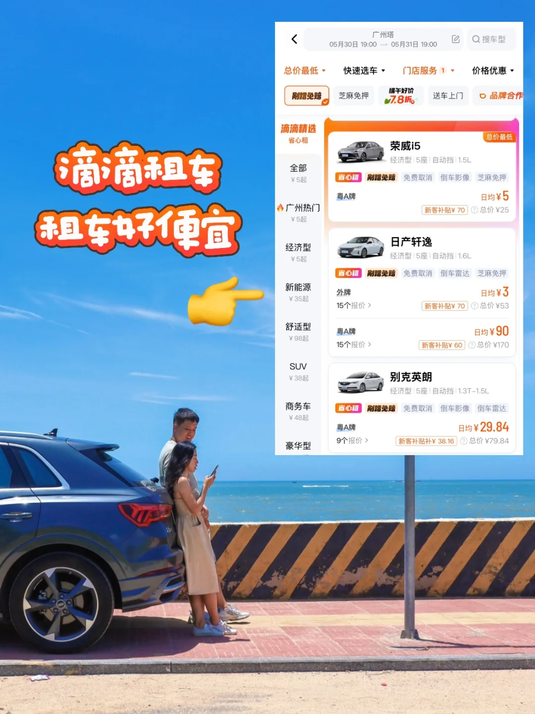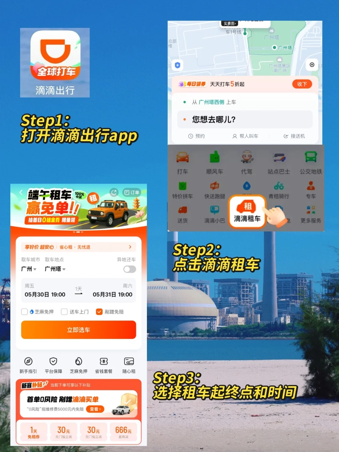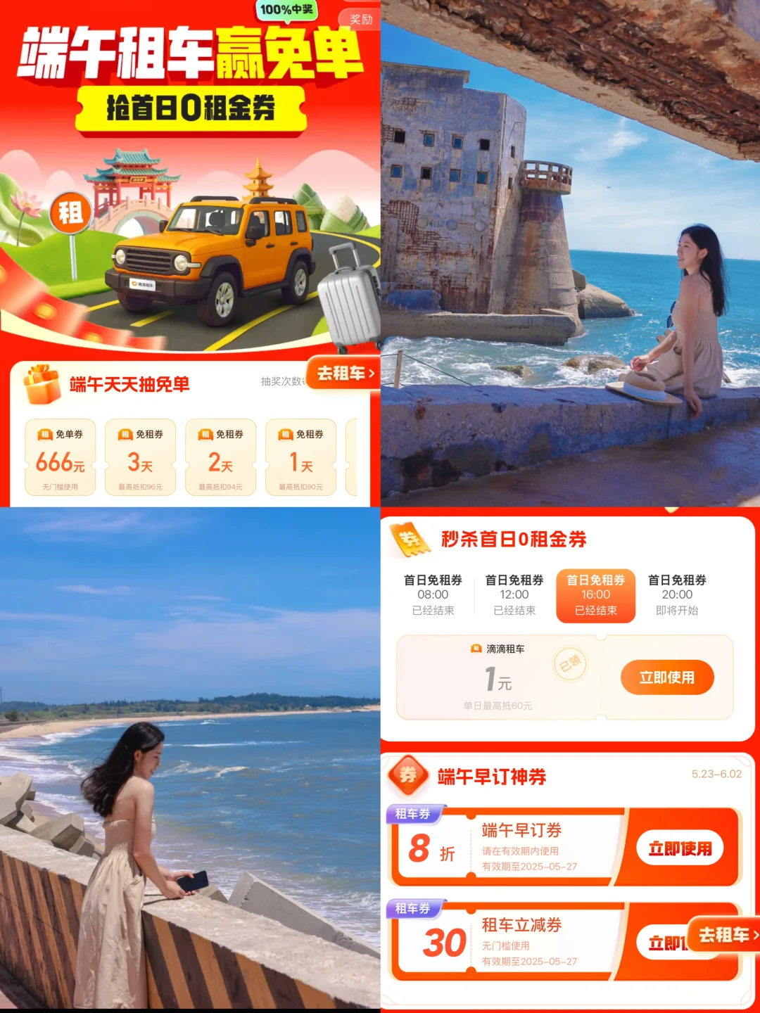 夏天到啦 又到了看海的季节了🌊 广东汕尾,就是一个很不错的海边度假 从广州出发自驾3小时就到了🚗 这里风景很美,海水湛蓝,有风车、有古堡 能下海游泳、赶海捉海鲜、和各种海上娱乐项目 还能品尝到很多地道的潮汕美食💯 很适合情侣出游、家庭出游游玩 汕尾2日游攻略已整理好啦,快码住吧❗️ - 📍位置:广东·汕尾 🚗汕尾当地交通不方便,景点之间只能驾车前往 📱建议大家可以像我们一样提前在滴滴出行app上点击「滴滴租车」租好车,这次横向也对比了其他比较大的平台,之前一直是在某神租车的,这次朋友推荐了滴滴,价格确实够便宜,而且新客是有剐蹭免赔的(这个下边说)。车子的选择很多,车况也好得没话说,同样的车型和行程,比有些平台便宜不少!而且平台给的优惠券、折扣活动特别多,每次下单都能省点钱,算下来比自己打车划算多了~ 在6月7日前新人首单租车,赠送“新人剐蹭免赔”权益,维修费5000元内免赔,这个权益对新手司机真的太友好,太有保障了~ 📅滴滴出行app在端午期间5月25日-6月2日福利多多,限量抢首日0租金券,还有抽奖活动,抽就有奖品,运气好还能“免单”哦❗️另外还有“端午彩蛋惊喜”,在西安、乌鲁木齐、广州租车,门店随机赠送限量的端午礼包一份(艾草眼罩、艾草锤、粽子),还会额外赠送一个城市限定版玩偶!(别忘了每周四五六蹲蹲好礼活动,抢免租券、租车无门槛直减券等福利哦) - 🌊【行程攻略】 🔻Day 1 ➠金町湾:被网友们称为广东“济州岛”的网红海滩 ➠二马路:品尝地道潮汕美食,德记牛腩火锅、杯杯鲜果汁、林舜杰薄饼、源记菜粿…… 🔻Day 2 ➠风车岛:沿海公路、海上风车、白沙滩、随手一拍都很好看 ➠海上古堡:蓝色大海里的一座古堡,巨浪拍打石墙时,浪花能卷起几米高,很震撼 ➠洪海湾:有很多娱乐设施,可以在海里游泳、玩沙滩车、浆板… ➠海边路:蔚蓝的大海、蜿蜒的小道、彩色的小房屋,和东山岛有几分相似 -