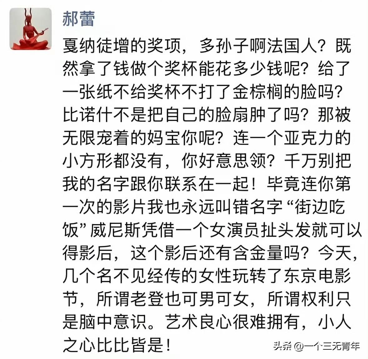 一张疑似郝蕾朋友圈的截图疯传,内容简直是火力全开。 她炮轰戛纳电影节为《狂野时