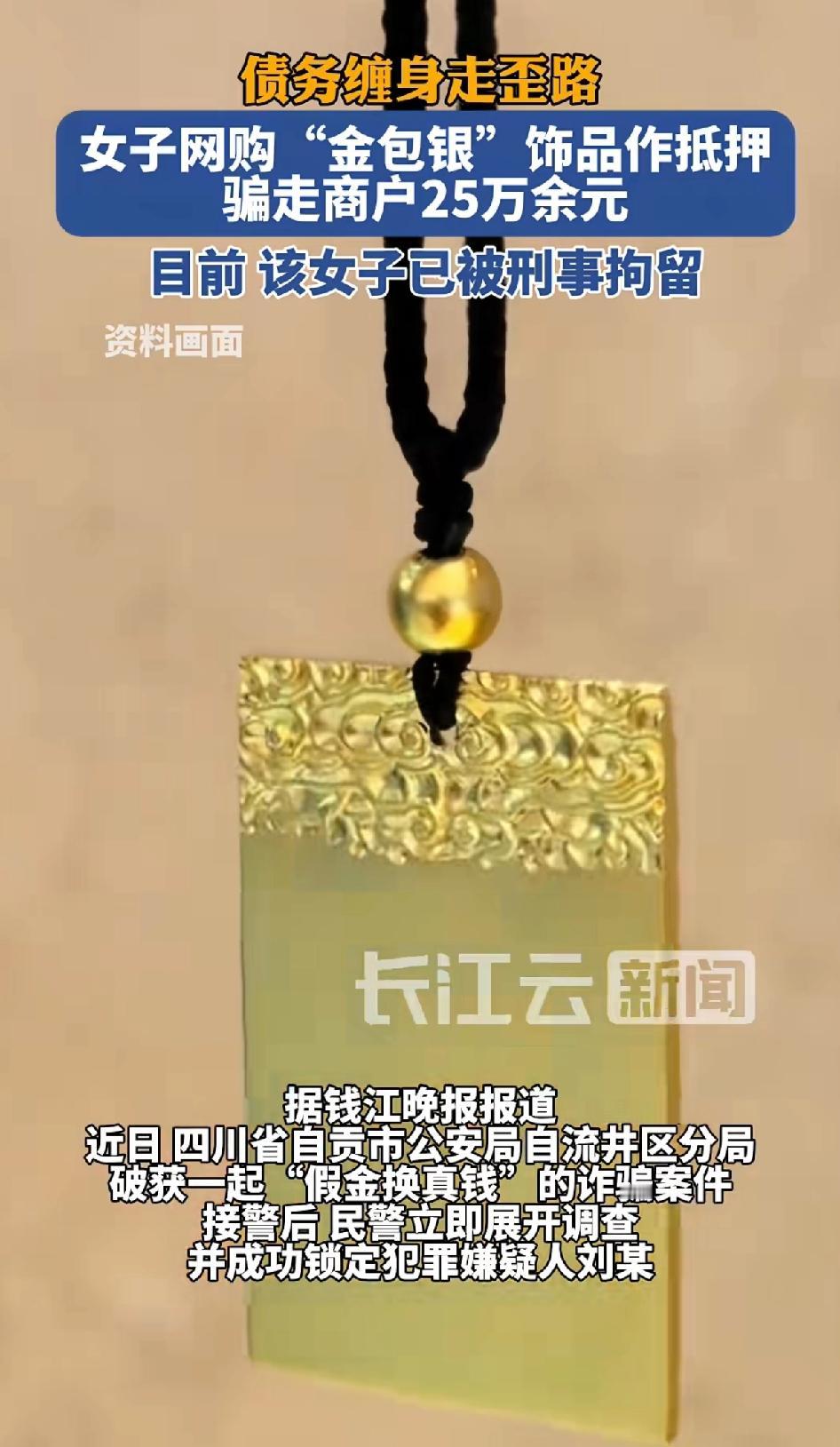 债务缠身走歪路,女子网购“金包银”饰品作为抵押物骗走商户25万余元。 目前该女子已被刑事拘留。 四川自贡的小刘,外债缠身就动了歪心思。今年8月,她找到做黄金抵押生意的黄老板,第一次用真金吊坠抵押,让黄老板放松了警惕。 之后,她以水果店周转为由,多次用“黄金”抵押借款。黄老板疏忽大意,没再仔细查验。 直到9月才发现,后续的“黄金”竟是网上花几千元买的“金包银”。 这个黄金抵押老板也真是大意了,如果是别人无法验证,这是专业人士竟然会被骗。 一是老板疏忽大意,二是骗子精心策划,才会前前后后骗了25万元之多! 小刘前后骗走25万余元,都拿去还债和挥霍了。想尽办法骗老板的钱,也不想想迟早会被发现的。 拿到钱不想着好好经营,竟是拆了东墙补西墙,再去挥霍一空。 如今她已被刑拘,这就是贪心的下场。做生意还是得谨慎,别被信任冲昏头脑。