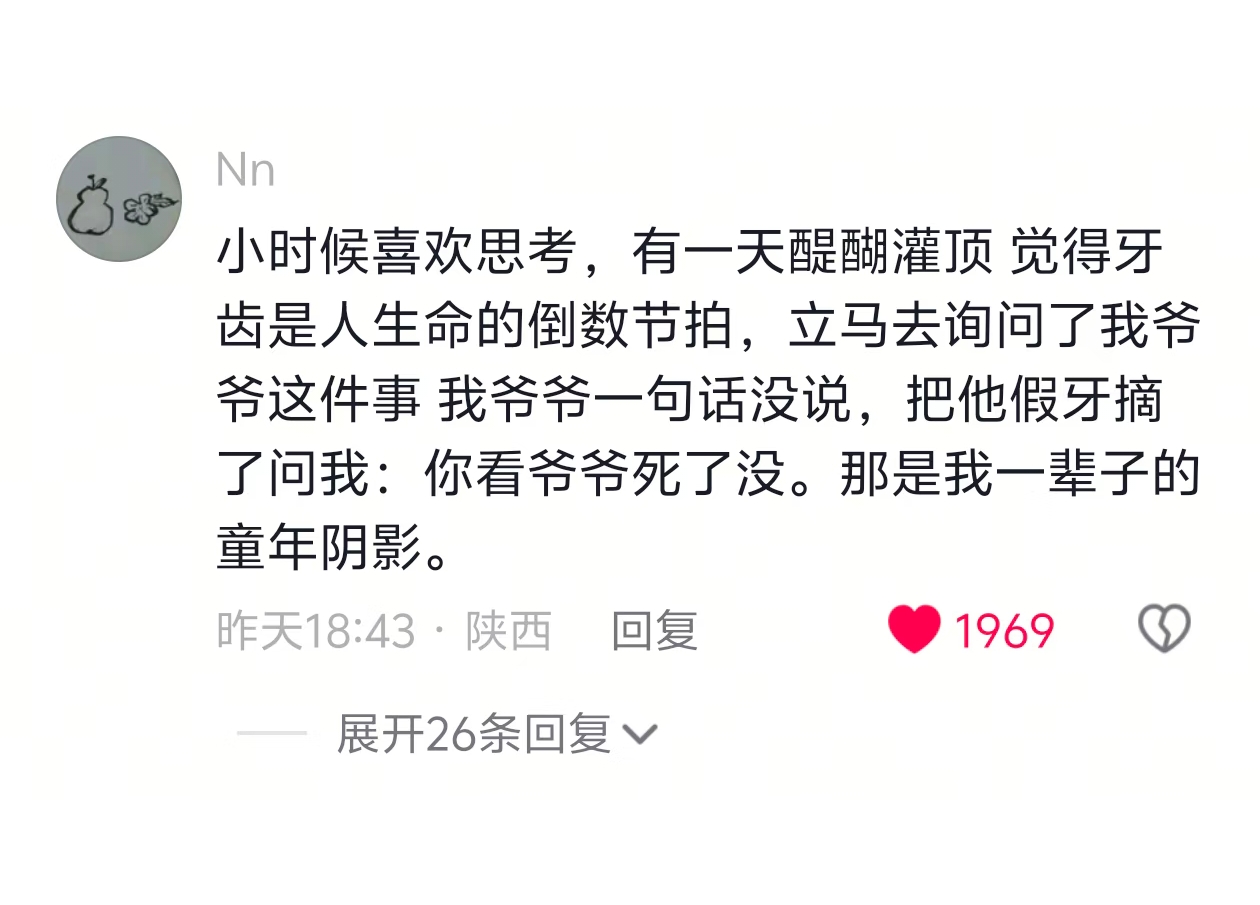 我爷爷一句话没说,把他假牙摘了问我:你看爷爷死了没,那是我一辈子的童年阴影。
