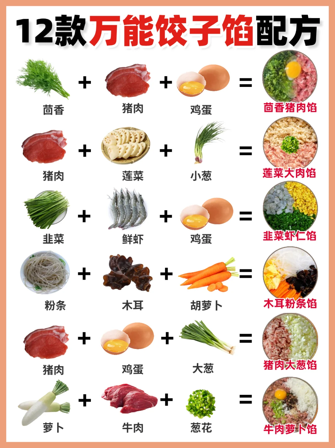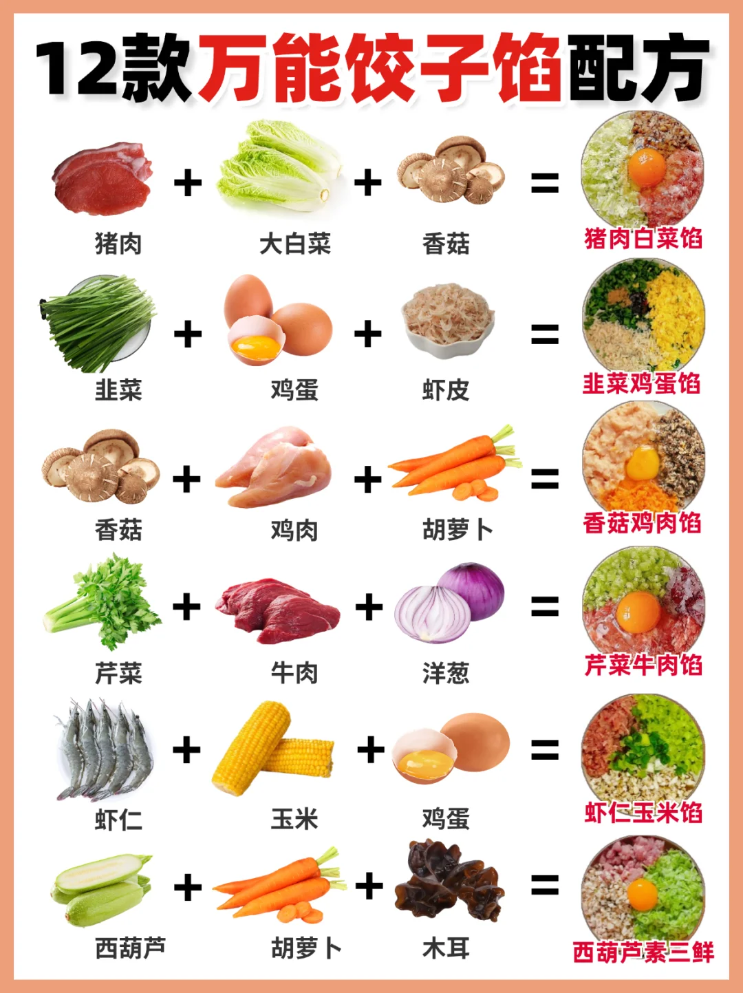 给大家分享12款家常万用饺子馅配方,按我的方法调出来的饺子馅真的超美味,附赠料汁的调法,大家赶紧码住吧!