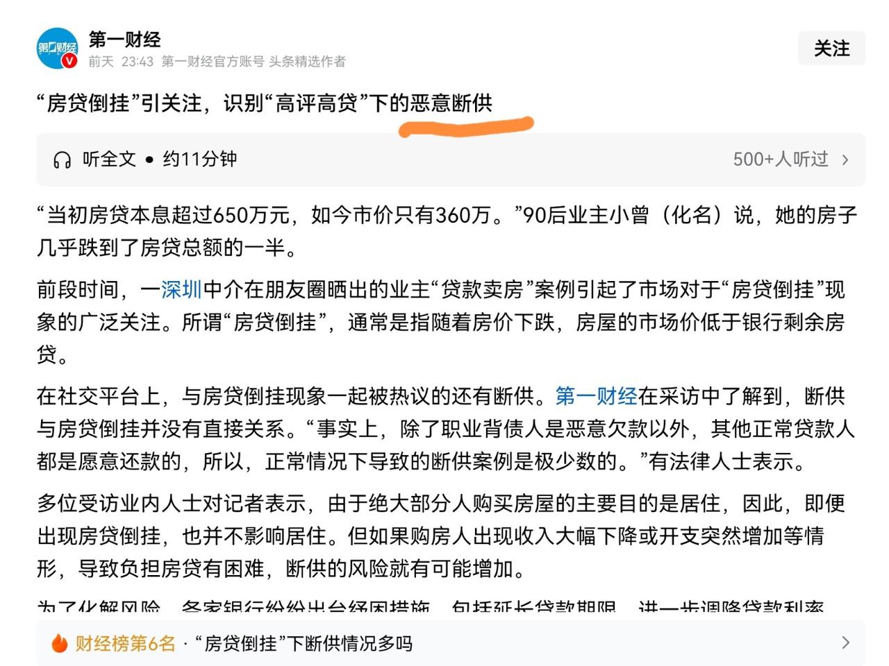 “恶意断供”这个新词,最近戳中了无数购房者的痛处,当650万元的房贷本息压在身上,房子市值却只剩360万元,就算把房卖掉也填不满债务窟窿,这种“资产倒挂”的绝望,不是“恶意”而是“被逼无奈”。 在房地产下行的当下,这样的案例早已不是个例,从深圳关外的二手房到郑州的烂尾楼周边小区,无数家庭正被“买时高价、卖时腰斩”的现实碾压,而当初掏出的首付,更成了打了水漂的“沉没成本”。 要搞懂“恶意断供”的根源,得先看清这场“资产倒挂”的残酷:一套2021年以500万元买下的房子,首付150万元,贷款350万元,30年等额本息还款,算上利息总房贷达650万元。 可到2024年,同小区同户型二手房成交价跌到360万元,就算业主咬牙卖房,拿到360万元后,还完银行350万元本金和已还的部分利息,不仅首付150万元血本无归,还可能欠银行一笔利息差额。 更惨的是有些家庭还面临“月供断供即法拍”的困境。郑州某业主2020年以1.8万元/㎡买的房,2024年房价跌到0.9万元/㎡,月供6000元还了4年。 如今断供3个月,房子被银行申请法拍,起拍价仅为当初购房价的50%,拍出去后不仅一无所有,还得欠银行十多万元。这样的现实下,“断供”哪里是“恶意”,分明是走投无路的选择。 而这场危机的推手是过去几年房地产市场的“非理性狂欢”和如今的“断崖式下跌”。2018-2021年,不少城市靠着“土地财政依赖”和“炒房热潮”,房价被推到虚高位置。 深圳某片区房价从5万元/㎡飙升到12万元/㎡,杭州部分板块一年涨50%,开发商和中介还在鼓吹“房价永远涨”“买晚了就买不起”。 无数家庭被裹挟着上车,有的掏空“六个钱包”凑首付,有的借高利贷补资金缺口,甚至有人“高杠杆炒房”,幻想靠房价上涨实现财富自由。 可2022年起,房地产市场急转直下,房企暴雷导致烂尾楼增多,人口下降、需求减少让二手房挂牌量激增,供大于求的市场下,房价只能“以价换量”。 青岛某小区2021年成交价2.2万元/㎡,2024年挂牌价1.3万元/㎡仍无人问津,北京通州部分二手房三年跌了40%,这样的跌幅让当初“高负债买房”的家庭瞬间陷入绝境。 “资产倒挂”背后,购房者还要面对“双重损失”:一方面是首付打了水漂,另一方面是断供后的信用破产。银行对“断供”的处理毫不留情,逾期3个月就可能启动法拍程序,法拍房通常以低于市场价20%-30%的价格成交,拍得款项优先还银行贷款,不足部分银行还会继续向业主追偿。 同时断供记录会纳入征信系统,业主未来贷款、办信用卡都会受影响,甚至可能被列为失信被执行人,限制高消费。 深圳某购房者2021年贷款400万元买房,2023年断供后房子被法拍,亏了首付120万元,还欠银行20万元,如今连孩子上学都受牵连。这种“既要赔钱又要背债”的结局,让很多人感叹“还不如当初不买房”。 但把“断供”简单归为“恶意”,显然是忽视了市场的系统性风险。过去房地产被当作“稳赚不赔”的投资品,开发商、银行、中介都在推高房价,却没人提醒购房者“风险”。 如今市场下行,风险却全由购房者承担,银行一边催缴房贷,一边收紧贷款政策,开发商更是早已拿着购房款“跑路”或躺平。 对比2008年美国次贷危机,当时美国政府还会出台“房贷重组”“纾困计划”帮助购房者,而现在国内部分城市虽推出“带押过户”“房贷利率下调”等政策,但对已经“资产倒挂”的家庭来说,这些政策只是“杯水车薪”。 利率下调每月能省几百元,可面对几百万元的资产差额,根本无济于事。 “恶意断供”这个词,更像是给购房者贴上的“负面标签”,却回避了房地产市场长期积累的问题。 当无数家庭被“买房即保值”的谎言裹挟,当高房价透支了三代人的积蓄,当市场下行时无人兜底,“断供”就成了部分人的最后选择。 这不是“恶意”,而是对“高房价泡沫”破裂的无奈承受。未来,若想避免更多“资产倒挂”悲剧,不仅需要稳定房地产市场,更要打破“房地产依赖症”,让房子回归“居住属性”,而不是让普通人成为市场波动的“牺牲品”。 毕竟一个健康的市场,不该让购房者为过去的狂欢买单,更不该用“恶意”二字,掩盖背后的系统性风险。