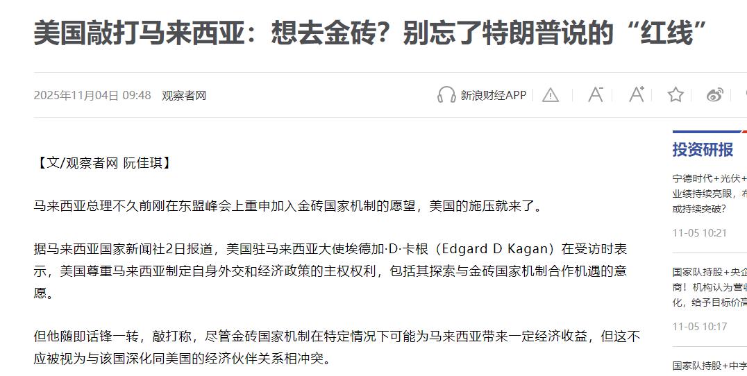 马来西亚申请加入金砖,美国大使公开威胁:不要越过红线   双标见过不少,但这么明着来的真少见。马来西亚想申请加入金砖国家,本来就是人家自己的事,结果美国驻马来西亚大使卡根,先是装模作样说“理解马来西亚的想法,也承认人家有自己选的权利”,可话头一转就开始放狠话,特朗普总统已经划了“红线”,马来西亚要是敢越过去,就得付出代价。这哪是外交辞令啊,分明是把霸权当命令,逼着人家必须跟自己站一队。   卡根还假装为马来西亚盘算:“金砖给的经济好处其实有限,你真想长期过好日子,还得跟西方的供应链绑紧点。”这话听着像好心提醒,骨子里全是威胁的算计。可马来西亚心里门儿清,自己的日子怎么过,凭啥要美国来定规矩?   马来西亚本来就是靠出口吃饭的国家,早就烦透了只盯着西方市场这一条路。这些年西方经济一会儿好一会儿坏,贸易保护主义又抬头,马来西亚出口的棕榈油、电子零件,动不动就被西方卡脖子。   再看金砖国家现在的排场:人口快占了全世界一半,经济总量也超了全球三成,这可是块实打实的大市场,谁都没法忽略。要是加入金砖,马来西亚的货就能更顺当地卖到巴西、印度、南非这些地方,等于给自家出口开了“第二条路”,这种能躲开风险的机会,换谁都不会随便扔了。   更实在的是,金砖一直在推的“不用美元结算、用自己国家货币做生意”,刚好戳中马来西亚的急需。这几年美元汇率上蹿下跳,马来西亚的外汇储备跟着忽上忽下,买国外东西的成本也涨得没边。但金砖国家之间做买卖能用本币结算,直接就绕开了美元波动这个坑。   就说中国,本来就是马来西亚最大的贸易伙伴,现在两国用人民币和林吉特结算的生意越来越多,真加入金砖,这种货币合作只会更稳,比绑在西方供应链上看美国脸色靠谱多了。   美国说金砖给的好处“有限”,纯属揣着明白装糊涂。现在的金砖早不是当年五个国家的小圈子了,加了埃及、伊朗这些新成员后,已经是九个国家的联盟。合作早就不只是做买卖了,基建、能源、科技这些领域都能搭上线。   马来西亚明年还是东盟轮值主席国,本来就打算借着金砖这个平台,拉着东盟和金砖国家一起合作,把自己的区域优势和新兴市场的资源捏到一块儿,这种长远的打算,哪是“有限”两个字能概括的?   至于美国划的所谓“红线”,说白了就是霸权逻辑在作祟。特朗普早放话了,要是金砖敢搞新货币代替美元,就给加100%的关税。现在马来西亚想加入这个“不用美元”的大平台,自然戳到了美国的痛处。   可全球南方国家早不吃“必须选一边站”这套了,泰国、印尼这些东盟邻居,也都在往金砖这边靠。大家要的是多几条合作路,不是被美国绑在战车上当炮灰。   卡根嘴里喊着“尊重主权”,却忘了主权最核心的就是“自己的路自己选”。马来西亚要的不是选边站队,而是在现在这个不是一家说了算的世界里找个平衡点;要的不是靠某一方“施舍”过日子,而是靠多找几个合作伙伴拓宽生路。   美国把自己的霸权利益包装成“致富秘诀”,想用“红线”逼别人放弃好机会,这种做法不光傲慢,更是根本没把国际规矩放在眼里。   现在的世界早不是美国说啥就是啥的时代了,金砖能越做越大,本身就说明越来越多国家想要更公平的规矩。马来西亚申请加入金砖,是顺着形势做的理性选择,不是给谁“站队”。美国与其忙着给别人划“红线”,不如好好想想怎么放下霸权架子,毕竟现在全球做生意的年代,威胁和施压换不来合作,只会把更多国家越推越远。