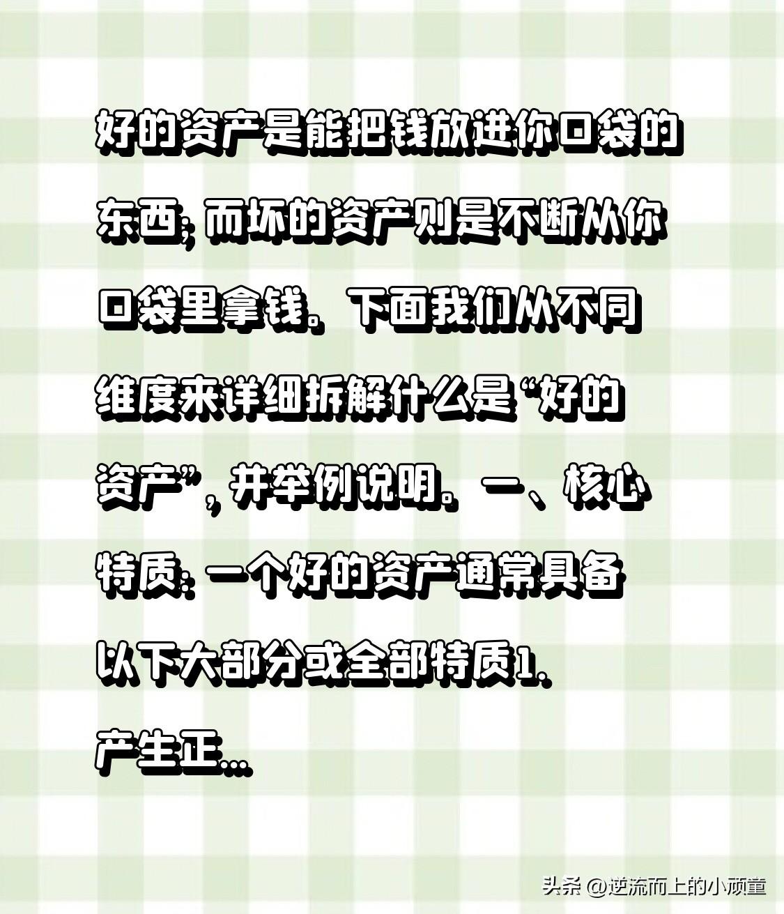 好的资产是能把钱放进你口袋的东西;而坏的资产则是不断从你口袋里拿钱。 下面我们从不同维度来详细拆解什么是“好的资产”,并举例说明。 一、核心特质:一个好的资产通常具备以下大部分或全部特质 1. 产生正向现金流 ◦ 这是最重要的特质。 资产本身能持续产生收入,覆盖其持有成本后还有盈余。 ◦ 例子: 出租的房产(租金 > 月供+税费+维修)、分红的股票、派息的基金、能盈利的生意。 2. 有增值潜力 ◦ 资产的市场价格随着时间的推移有上涨的趋势。 ◦ 例子: 优质地段的房地产、具有强大护城河和成长性的公司股票(如苹果、腾讯)、稀缺的艺术品或收藏品。 3. 具备稀缺性 ◦ 供应有限或无法被轻易复制的资产,其价值更稳固。 ◦ 例子: 核心城市的土地、比特币(总量有限)、大师级的艺术品、专利和知识产权。 4. 有实际用途或内在价值 ◦ 资产本身能满足某种需求,而不只是投机工具。 ◦ 例子: 房产可以居住,黄金可用于工业和高科技,一家公司能生产社会需要的产品或服务。 5. 高流动性 ◦ 资产能快速、低成本地转换为现金。流动性差的资产在需要钱时可能面临折价出售的风险。 ◦ 例子: 上市公司股票、货币基金(高流动性但收益低)。相比之下,房地产、私募股权流动性较差。 6. 风险可控 ◦ 资产的价值波动在可接受范围内,或者其风险可以通过策略进行对冲和管理。 ------ 二、不同类别的“好资产”举例 1. 金融资产 • 指数基金(如标普500、沪深300指数基金): 对于绝大多数人来说,这是最好的资产之一。它分散风险(一篮子优质公司)、长期看有增值潜力、管理费低、流动性极高。 • 优质公司的股票: 拥有强大品牌、持续盈利、稳健财务和良好管理层的公司(常被称为“蓝筹股”)。它们能通过股价上涨和股息为投资者创造财富。 • 债券/国债: 提供稳定的利息收入,风险相对较低,是资产配置中用于平衡风险的重要部分。 2. 实物资产 • 核心城市的房地产: 尤其是能产生稳定租金回报的住宅或商业地产。它结合了现金流(租金)、增值潜力和抗通胀能力。但需要关注选址、管理和流动性问题。 • 黄金/白银: 传统的避险资产和抗通胀工具,在全球经济不确定性高时表现较好。但它本身不产生现金流。 • 基础设施: 如收费公路、电站等,能产生非常稳定的现金流,但门槛极高。 3. 无形资产(最重要的资产) • 你自己的知识和技能: 这是最容易被忽视,但潜力最大的资产。通过教育、培训和实践提升技能,可以极大地提高你的劳动收入,而劳动收入是大多数人进行投资、购买其他资产的初始资金来源。 • 知识产权: 如专利、版权、商标。一旦创造出来,可以持续产生被动收入(如版税)。 • 一个成功的品牌或商业模式: 例如,你创立了一家有稳定客户和利润的公司。 ------ 三、重要的提醒:观念比具体资产更重要 1. “好”是相对的: 适合A的资产不一定适合B。这取决于你的财务目标、风险承受能力、投资期限和专业知识。例如,高风险的风投项目对退休人士是“坏资产”,但对年轻的风险投资者可能是“好资产”。 2. 资产配置是关键: 不要把所有鸡蛋放在一个篮子里。一个好的资产组合应该包含不同类型、不同风险等级的资产,以达到平衡。 3. 分清消费与资产: 很多人误把负债或消费当资产。一辆新车从开出4S店就开始贬值,是负债;一套自己住的房子,如果不产生租金且需要持续支付物业、税费,它更偏向于耐用消费品,而非严格意义上的“生钱资产”。 4. 警惕“热门”投机: 那些只靠市场情绪炒作、没有内在价值支撑的东西(如某些山寨加密货币、传销项目),通常是高风险的投资陷阱,而非好资产。 总结 一个好的资产,本质上是一个能为你高效工作的“雇员”。 它不需要你持续投入大量时间和精力,就能为你创造收入和财富。 对于普通人而言,最好的起点是: 投资于自身教育(提升赚钱能力) -> 将储蓄定期投入低成本指数基金 -> 在知识和资本积累到一定程度后,再考虑房产、个股等更复杂的资产。 财富价值规律 复利资产 资产的真相 资产属性 资产攻略 资产利用技巧 富人资产
