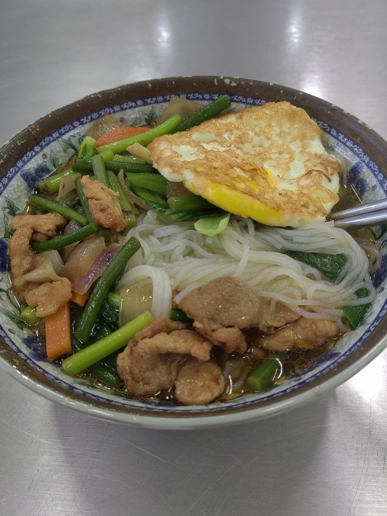 一碗热腾腾的米线,搭配上煎蛋,还有我喜欢的肉炒蒜苔,美味满满,幸福感爆棚。
