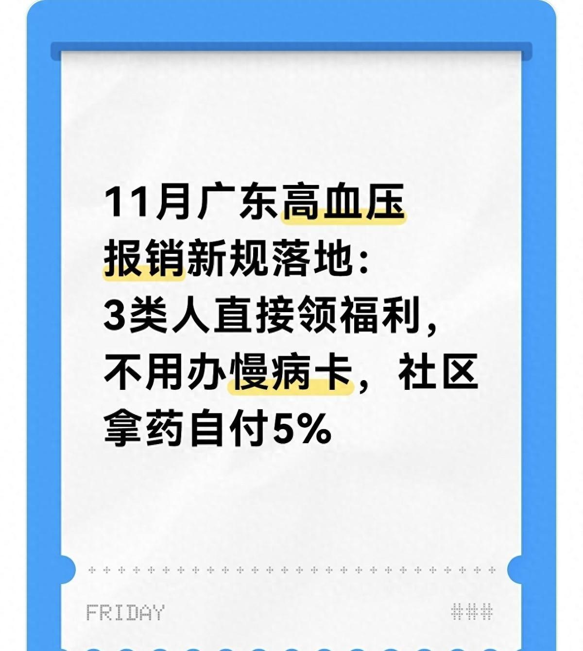 11月广东高血压报销新规落地:不用办慢病卡,社区拿药自付5% 11月开始,广东高血压患者迎来一波实打实的福利升级。原本得跑两三趟医院办慢病卡,现在只要在二级以上医院确诊,信息可以自动同步,不用额外跑手续。刷医保码就能直接报销,省事又省时间。最大奖励是社区医院的报销比例提升到95%,多了个“真划算”的选择。以前拿药总在大医院,报销比例低,自己要多花钱,现在在社区医院拿药,差不多只自付5块钱,划算得很。这次新政不仅免除繁琐手续,还把血压监测、检查和康复都纳入报销范围,保证高血压患者的治疗流程更完整。只要医保正常缴费,符合确诊标准,持有广东居住证或本地户籍,或者符合特殊群体条件,都能享受这波福利。流程又简化,只需在点对点的定点医院打卡就诊、告知用药需求,结账时刷医保凭证就能自动报销。真实算下来,一年下来,老年人能省近千元,还能用更方便的方式管理疾病。这次政策让慢病管理变得更贴心,目标就是让患者少跑腿,多省钱。未来希望能持续优化,让更多慢性病受益。 素材来自网络,侵权联系删除