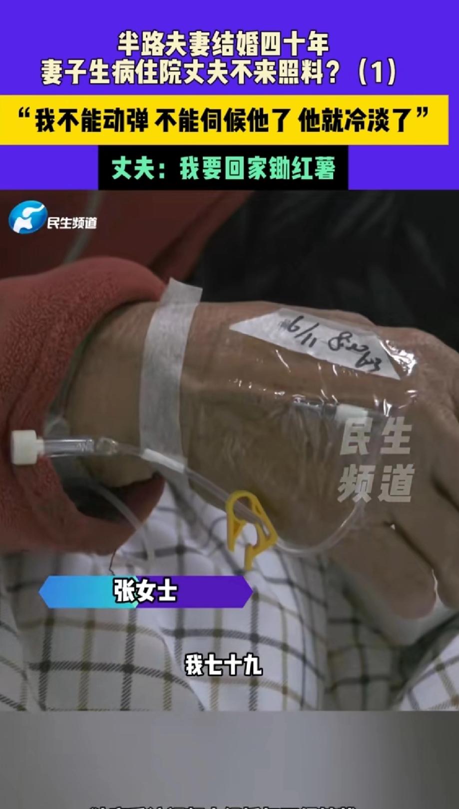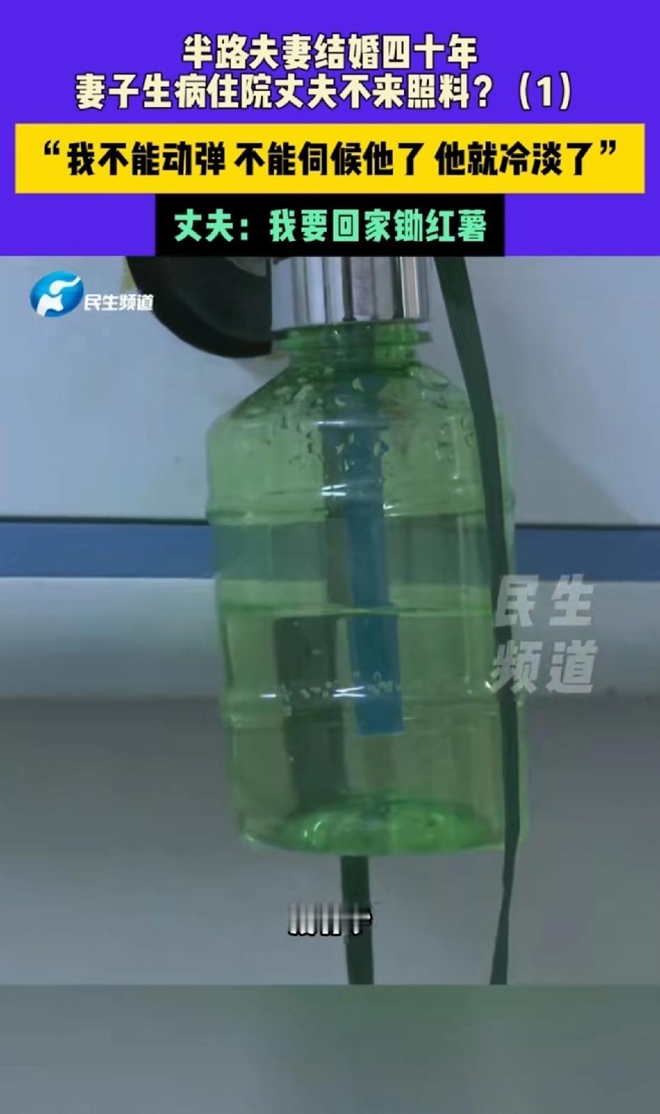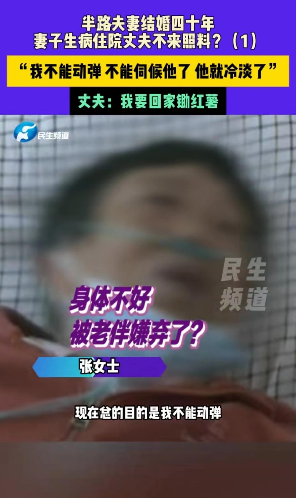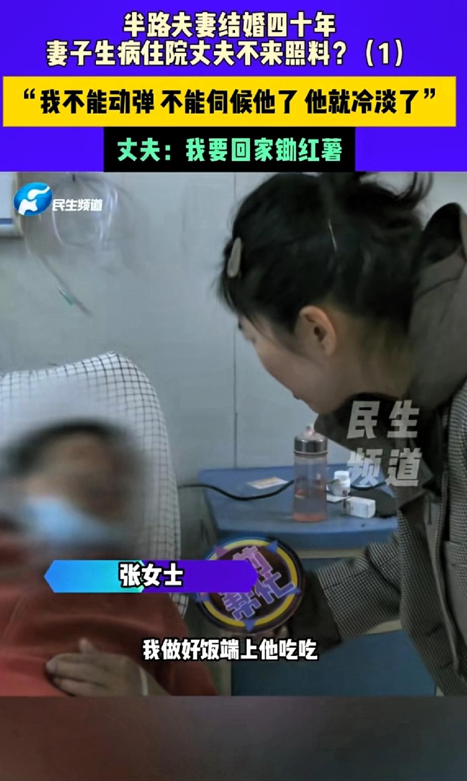 半路夫妻结婚四十年 妻子生病住院丈夫不来照料? "我不能动弹不能伺候他了他就冷淡了" 丈夫:我要回家锄红薯。 张女士我七十九,跟丈夫结婚四十年,平常我做好饭让他吃,一直都是我照顾他。 现在我生病住院了不能照顾他了,他就冷淡了。 记者找到丈夫,为什么不能照顾在床上的妻子,丈夫的回答让人意想不到!他称家里的红薯该刨了,自己要回家刨红薯! 妻子躺在病床上,在丈夫眼里家里的红薯比妻子更重要! 虽然二人是半路夫妻但也在一起过了40年了,按理说应该有深厚的感情! 谁知道男人始终比女人理性!一旦妻子没有价值了立马表现得很现实。 可惜妻子一直以来的付出,四十年的夫妻感情,从来没有怀疑过丈夫对自己的感情。 直到自己生病躺在床上才发现这个男人真实的嘴脸。 人们不都说少年的夫妻老来的伴,夫妻过到最后就成了亲人,老夫老妻到最后不就是做个伴互相有个照顾。 谁能想到有些人直到死还是充满算计!