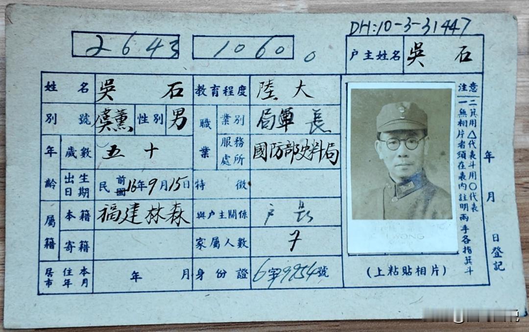 终于找到了吴石将军的户籍卡原件,这张户籍卡的生成时间约为1946年至1948年之间,南京解放前夕户籍登记档案。 在这张卡片上可以清晰的看到,吴石将军的年纪当时为50岁,“服务处所”为“国防部史料局”,“业别”为“局长”,教育程度为“陆大”,卡片上的照片显示吴石佩戴中将军衔。