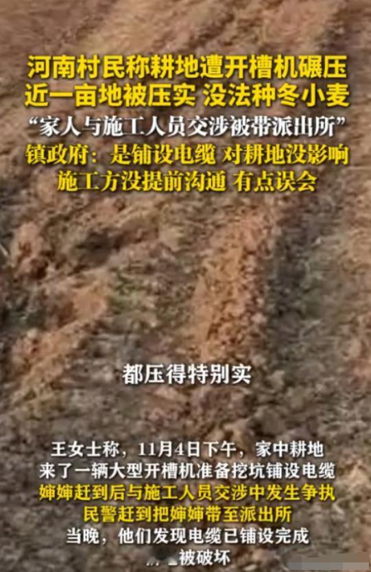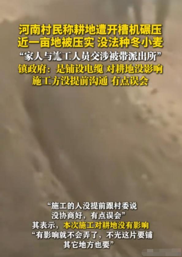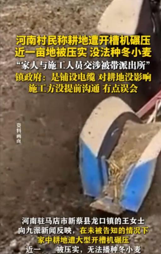 “真的是忘了提前通知吗?” 河南驻马店,一村民家的耕地,在没有得到任何提醒和通知的前提下,开槽机突然闯入并开始施工,导致近一亩的耕地不能正常种植小麦。村民婶婶找到施工方索要说法,但对方对于没有通知和补偿问题却闭口不谈,甚至村民婶婶被民警带走调查了3个小时。 民警将民妇带走三个小时调查没问题,符合程序,可为什么带走的不是施工方的人?这标准的耍流氓!带走调查为什么不一起带走?而是留下施工方继续施工? 现在不是农户不讲理,而是有些人有些乡村领导他都不跟你沟通,直接先干,这都出现了矛盾问题,要是说明白有谁会阻拦的? 这一招很高明啊,提前施工,谁来阻挡就把人抓走,一直等到施工完毕以后再把你放回来,就没人阻挡施工了,以后各地拆迁施工都可以参考,用这一招来对付老百姓! 在村民一无所知的情况下,便强行占用农民土地,对这种恶意抢劫农民耕地的恶劣行径必须予以坚决打击。