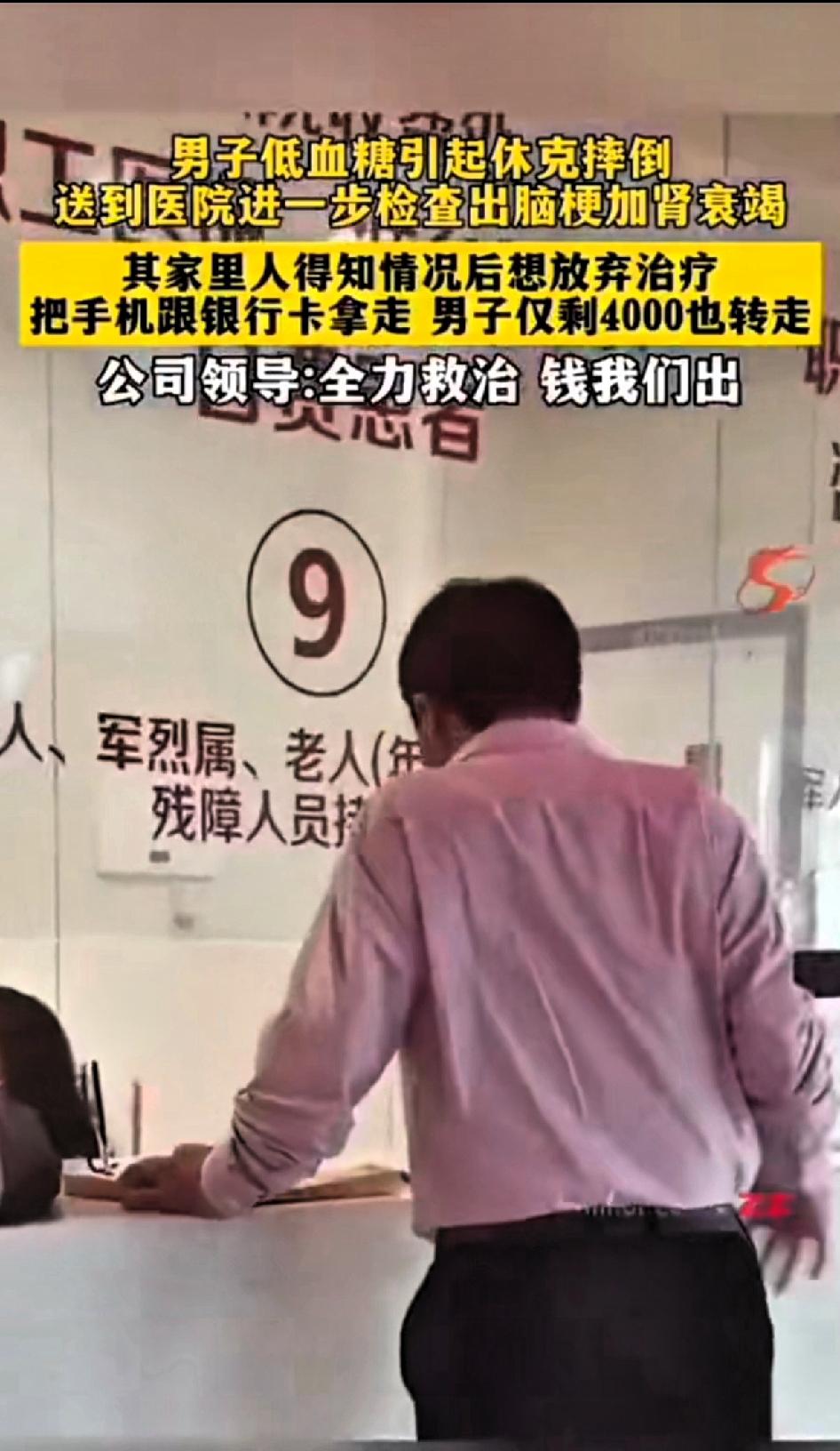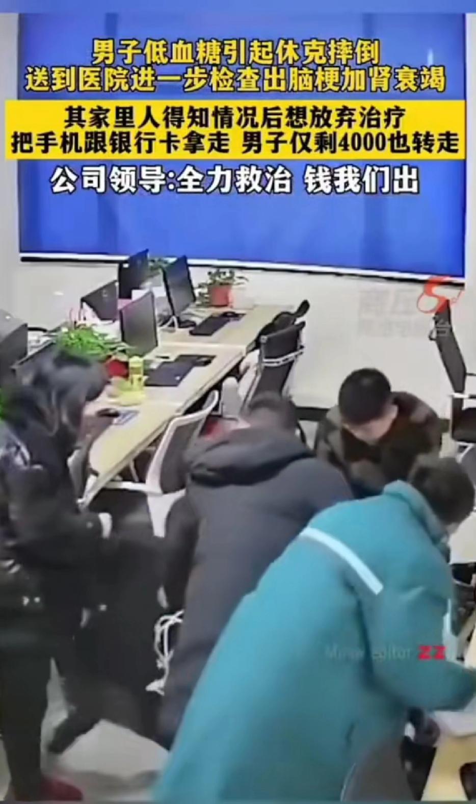 男子低血糖引起休克摔倒,送到医院进一步检查出脑梗加肾衰竭!这病情反转太吓人了!很多时候,低血糖这种“小毛病”容易被忽视。 其家人得知情况后想放弃治疗,把手机和银行卡拿走,把男子仅剩的4000元也转走! 公司知道后领导表示:全力救治 钱我们出! 人心难测,谁也想不到紧急时刻第一个抛弃男子的居然是男子家人。 人家说落井下石的都是外人和仇人, 这样家人真比十冬腊月的天气还寒冷! 幸好男子碰到一个好公司,要不然家人的落井下石真是加速了男子的死亡。 见过狠心的人,这样狠心的家人却是第一次见,只是才发现疾病,都没有尝试救治或者争取救治,就放弃了! 而且还把男子的手机和银行卡,仅有的4000块钱都转走,这是既不想救人又不想让他求救,这分明是想让他赶紧死! 有的时候再造之恩不是父母,有可能是公司。 男子这次的休克也恰恰说明体内的“病”向外界求助,如果不是低血糖晕倒,男子也想不到自己已经命悬一线了。 现实生活里也碰到过这种情况,骑着电车出去摔倒了去检查,结果查出别的问题。 倒也很庆幸出的这点小事故。
