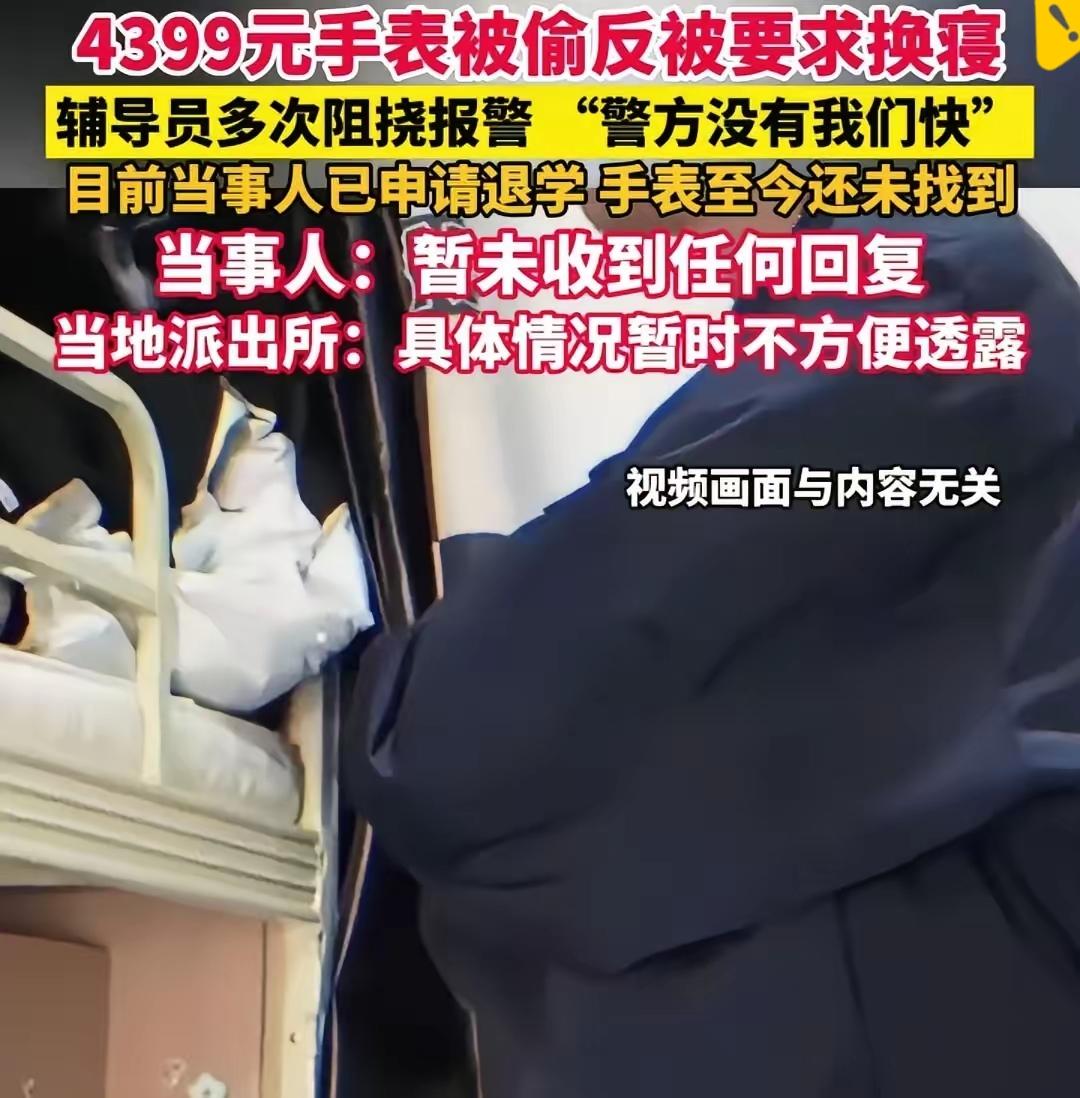 4399元手表被偷反遭退学 上海建桥学院这波操作真让人看不懂 刚入学没多久的女学生,手表定位直指新舍友床铺,正常报警维权却被辅导员百般阻拦,甚至遭电话质问。 更离谱的是,后来才知道这位舍友本就是因多次偷窃才调过来的,而辅导员不仅不解决问题,反而用断电逼走受害者,连学生母亲都被撵,最后女生被迫退学还被扣除五千多元,手表至今没找回。 受害者维权反被“惩罚”,有盗窃嫌疑的学生却被庇护,这辅导员的操作实在颠覆认知。 学校本应是守护学生权益的地方,如今却让受害者寒心,这样的处理方式何止是失职,更是在助长歪风邪气。 难道真如网友猜测,涉事学生和辅导员有特殊关系?还是说学校为了“息事宁人”,就可以牺牲学生的合法权益? 你觉得学校该如何处理这件事?辅导员该不该被开除?欢迎在评论区聊聊你的看法!