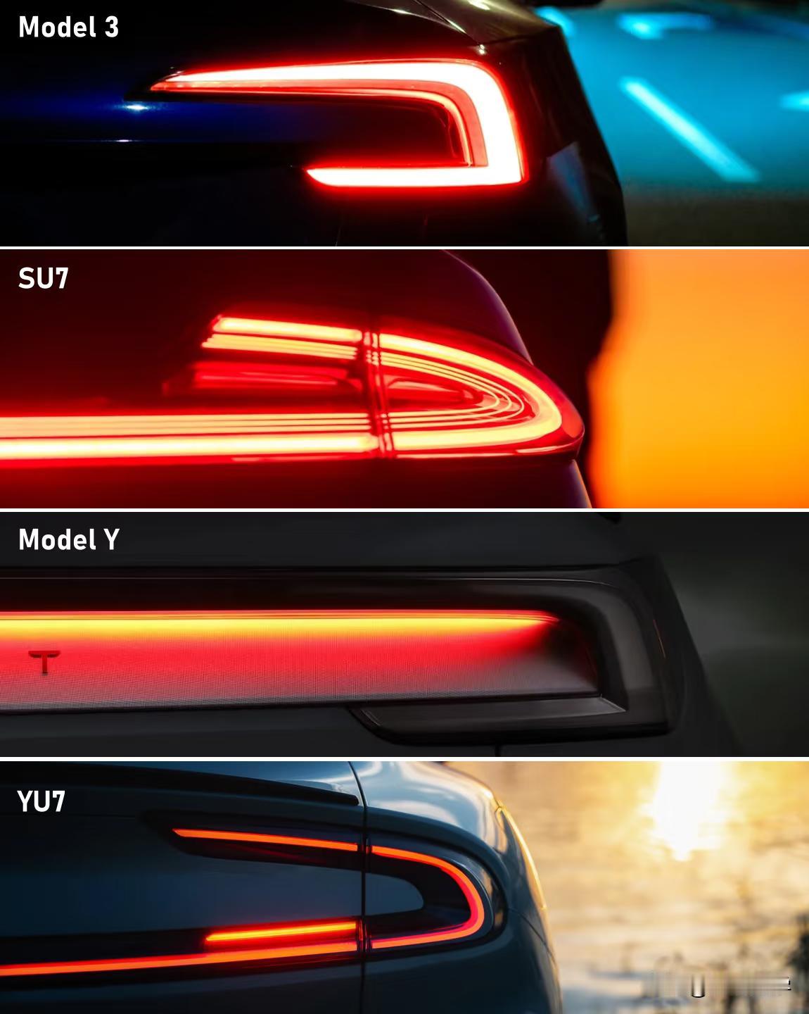 从特斯拉的两款车对比小米的两款车的尾灯来看,你更喜欢怎样的线条设计呢? 首先,是特斯拉Model 3的尾灯,它是那种两边独立的尾灯,有点像“刀”字的躺倒造型,给人的感觉就是像那种很刀锋战士的干净利落,雷厉风行的设计语言;而小米SU7呢,是用了土星环的设计,是贯穿式的尾灯,灯组线条并不是单一的一条,而是有层次的好几条星环组合在一起,点亮的时候还有迎宾灯的特效,情绪价值拉满。 接下来,我们在看看特斯拉Model Y的尾灯设计,非常简洁的一条横线,有人就吐槽特斯拉!Model Y就像拉高版的Model 3,邪恶大鼠标的形状,不过有人却喜欢特斯拉的这种简洁的设计语言;而小米YU7呢,在原来小米SU7的尾灯设计基础上,把土星环的弧度拉高了一些,这样设计的好处就是让人看上去更有肌肉感、力量感,毕竟小米YU7是一台SUV嘛,车尾的设计要比轿车更加的饱满立体。 对比了市面上销量第一梯队的四款车型的尾灯,可以看出,特斯拉和小米是两种不一样的设计思路,特斯拉是简洁经典,小米是优雅高贵,反正晚上开在大街上,四款车的尾灯都很有辨识度,让人一眼就能认出。特斯拉hw3 tmodel3 特斯拉字标 特斯拉腿 特斯拉缝线 特斯拉侧滑灯 特斯拉侧标