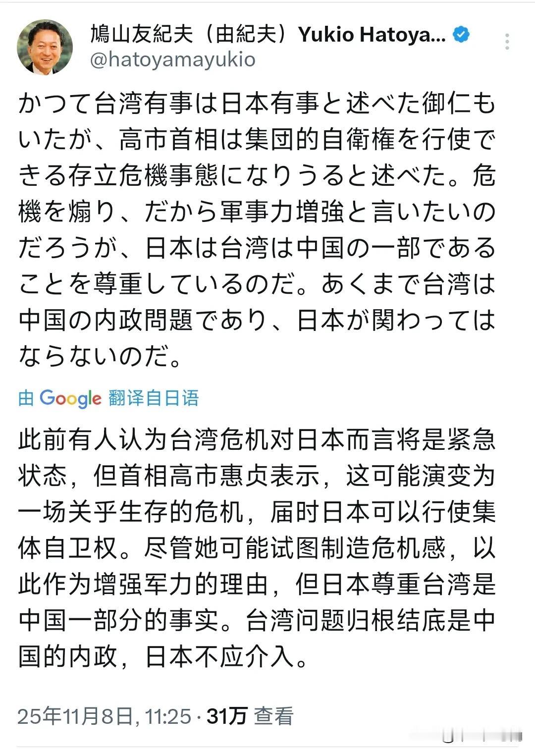 日本前首相鸠山由纪夫今天(11月8日)发文写道:“此前有人称称台湾有事是日本有事,但高市首相表示,这可能演变为一场关乎生存的危机,届时日本可以行使集体自卫权。尽管她可能试图制造危机感,以此作为增强军力的理由,但日本尊重台湾是中国一部分的事实。台湾问题归根结底是中国的内政,日本不应介入。” 评几句 鸠山由纪夫这番话,像是一记清脆的耳光,打在高市早苗这种“战争妄想家”的脸上。台湾有事就是日本有事?这是谁给的胆子,又是谁写的剧本?一个中国原则是国际社会的普遍共识,不是某些日本政客拿来刷存在感的道具。高市早苗的言论,不是“危机感”,是“挑衅感”,是把日本往火坑里带的节奏。 鸠山由纪夫说得直白:台湾问题是中国的内政,日本插什么手?这不是“战略模糊”,这是“战略清醒”。可惜,现在的日本政坛,清醒的人太少,炒热点的太多,把和平当筹码,把主权当交易的,更是大有人在。鸠山由纪夫的声音,虽然不大,却像一根刺,扎在那些还想借台湾问题翻旧账、搞新冷战的人身上,疼,但必要。 日本若真为自身安全着想,就该多听鸠山由纪夫的,少跟高市早苗这种“战争嘴炮”瞎起哄。