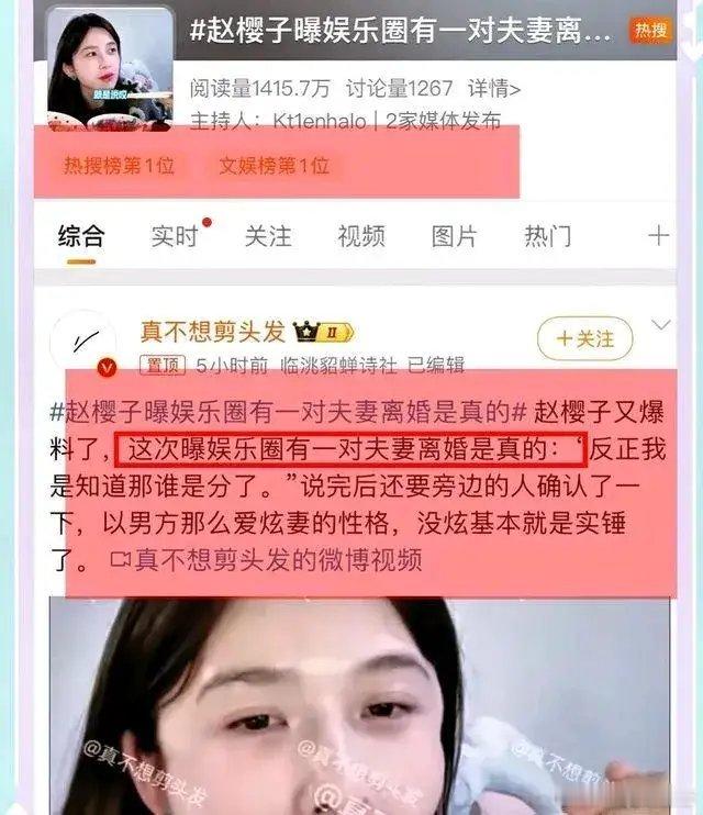 近日,34岁女演员赵樱子在直播时爆料说娱乐圈里一对夫妻已经离婚了,虽然她没有说具体是谁,但也引起不小热议,毕竟明星夫妻离婚在娱乐圈都是热点。
