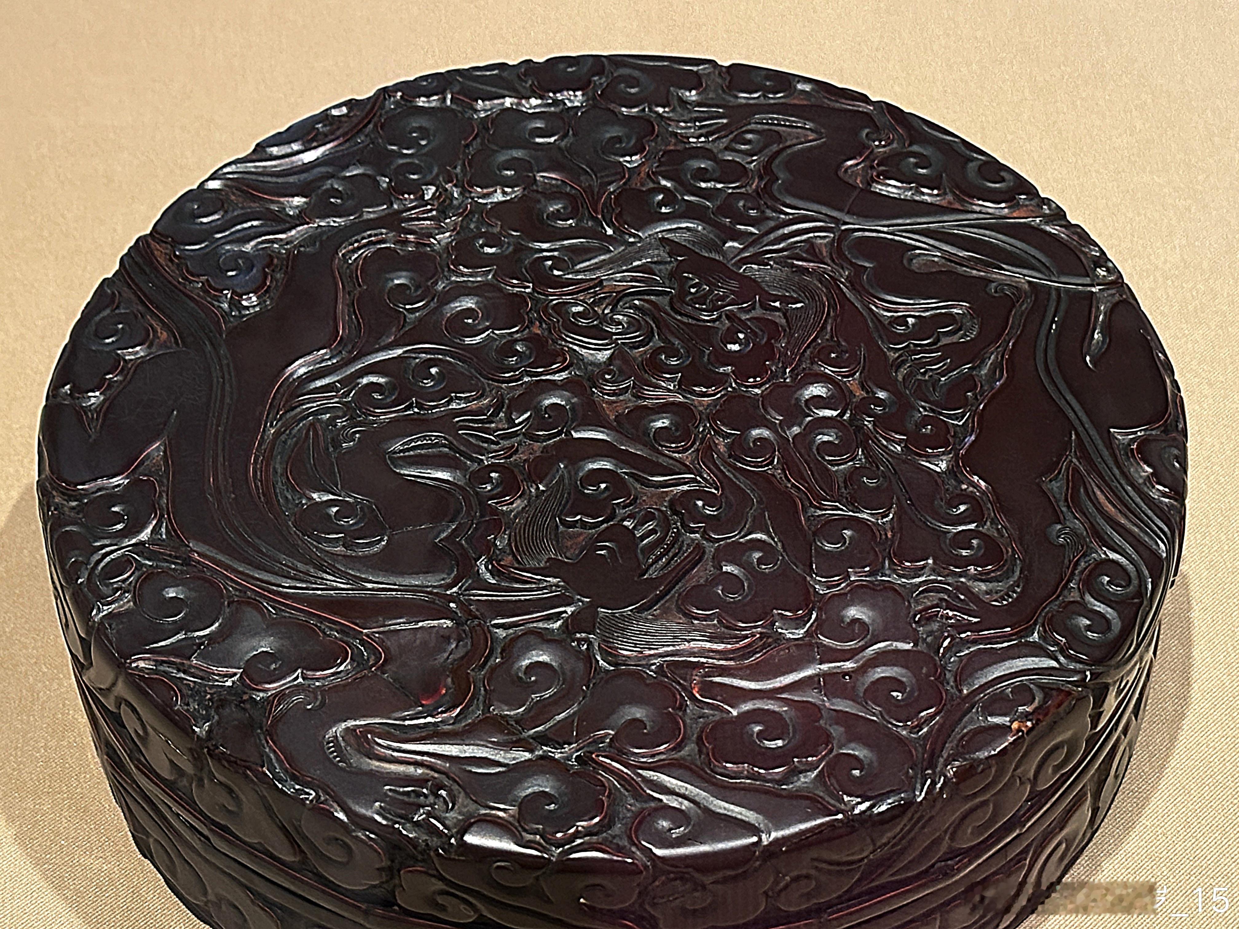木胎,连肩式盒,子母扣,圈足,底部及盒内髹黑漆。盖面黑、黄、朱三色叠髹,黑漆地上剔刻一对三爪螭龙相向穿行云间。螭龙呈S形身姿,通体无鳞,以细长阳线勾勒背脊,臂与肩丰腴饱满,四肢肌肉发达,动感十足。螭龙与云纹以红漆勾边。螭龙纹饰源自商周时期高规格青铜器,是典型的中国传统装饰纹样。