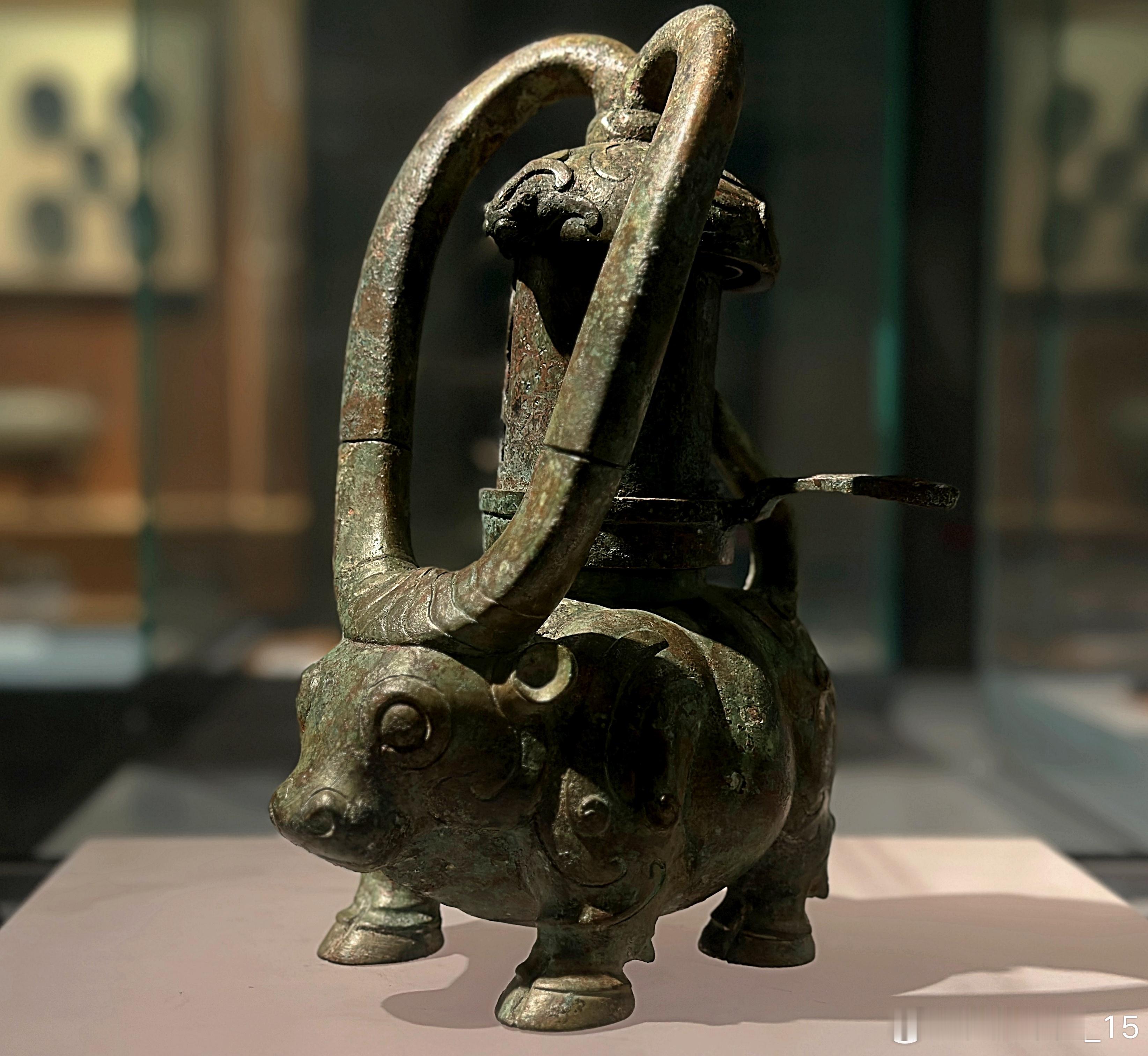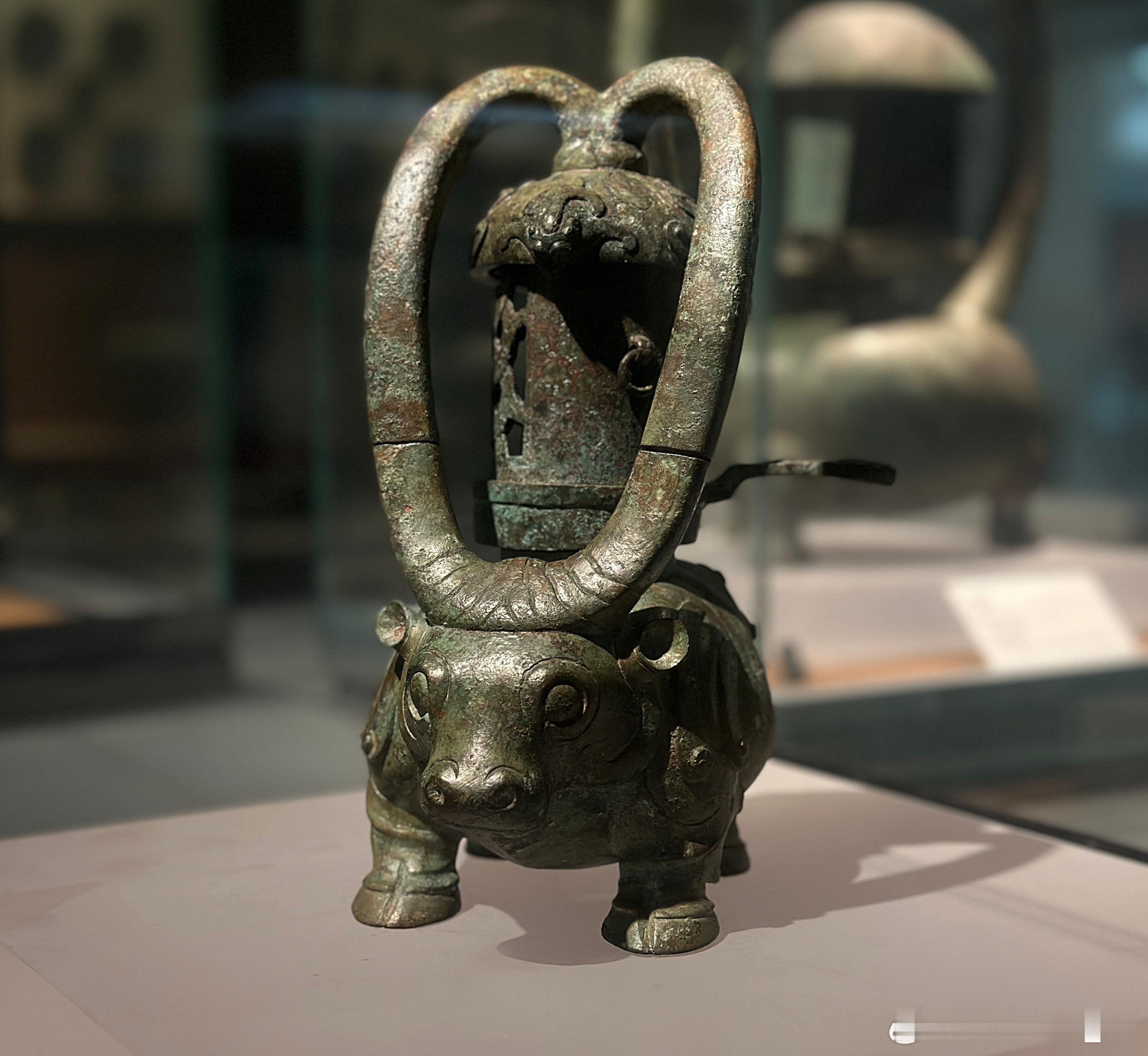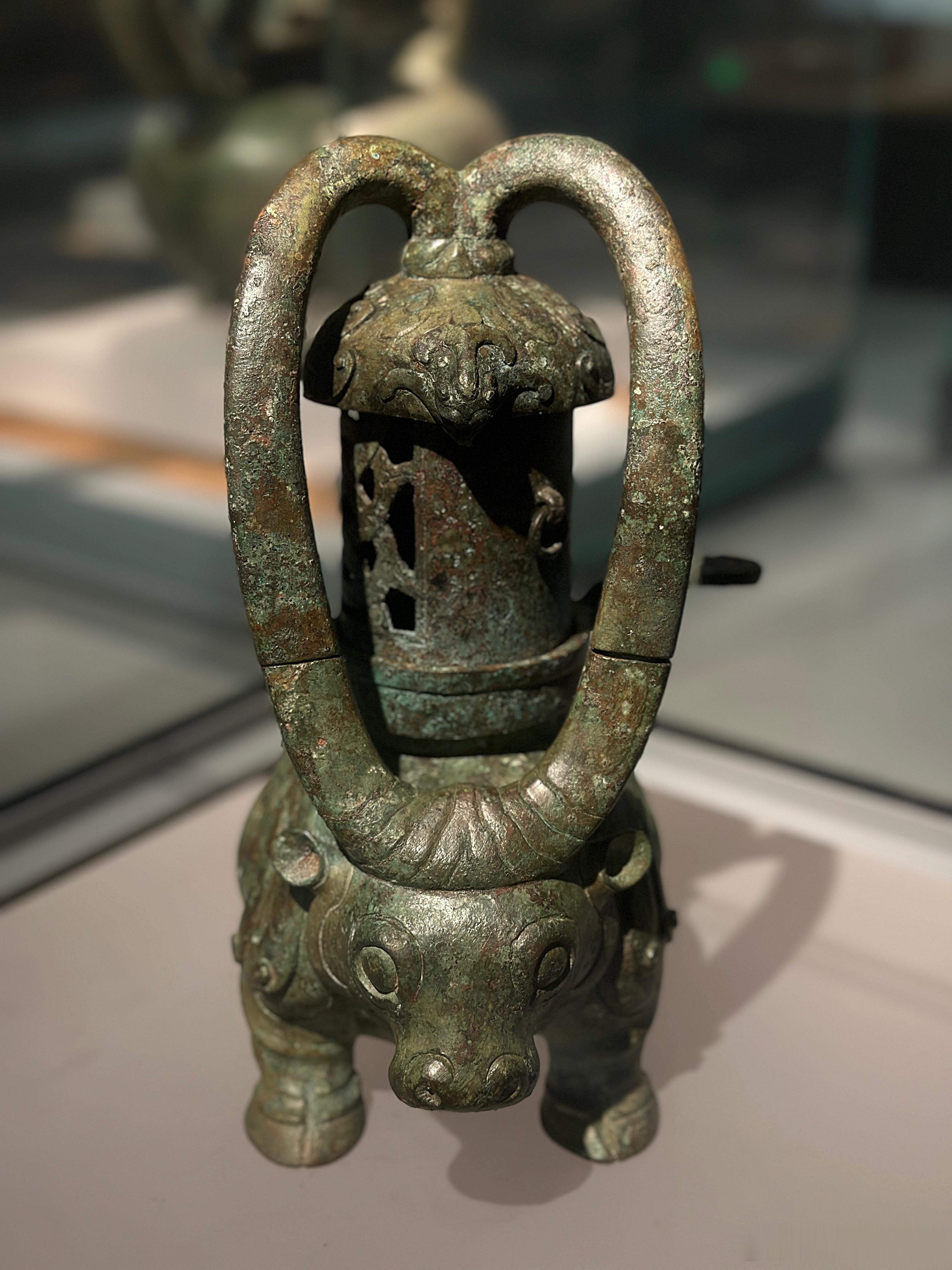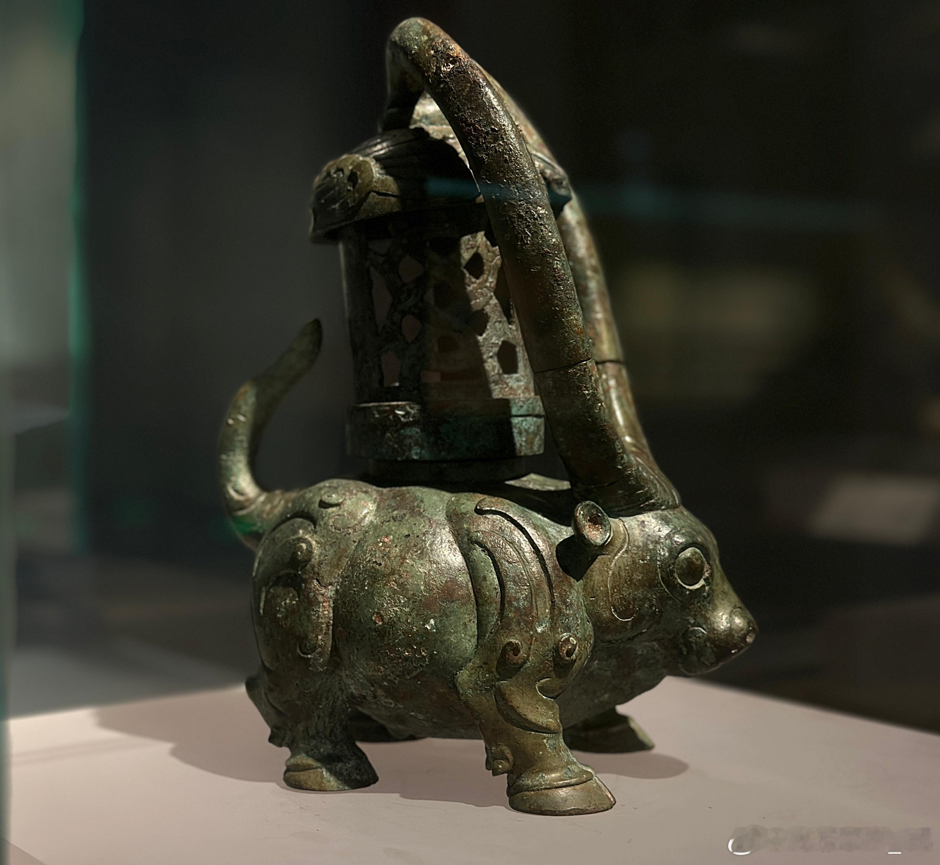 1975年睢宁刘楼东汉墓出土。此灯造型为一头站立的青牛,牛躯体浑圆结实,双目圆睁,神态憨厚可爱。牛身为灯座,牛背上一圆筒形灯罩,灯盖为一展翅的蝙蝠。灯罩可自由转动,调节灯光照明方向亦可防风。此灯设计精妙之处是将牛角做成圆筒形的烟道与灯盖相连,上升的烟尘进入烟道后下沉到牛的腹腔,通过牛腹的清水溶解烟尘以保持室内清洁。