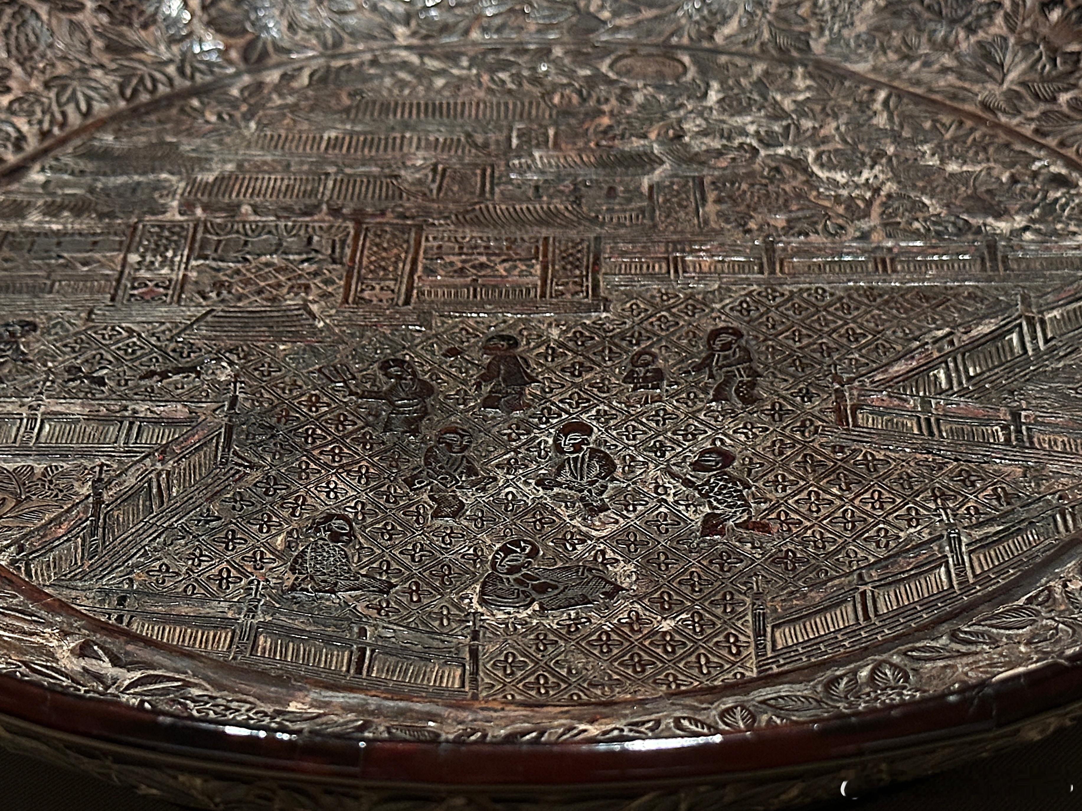 偏褐色黑漆圆盘。盘心为楼阁庭院图。孩子们在树木掩映的楼阁前嬉戏。或斗鸡,或玩拨浪鼓,或观鸡犬相争,或照看幼童。楼阁右上角高悬满月,内刻玉兔在桂花树下捣药。盘壁内外均饰蔷薇、山茶花、菊花、牡丹、木槿花、栀子花等。此盘描绘的是玉兔降临,童子欢欣的中秋夜团圆景象,寓意天人和谐、生活美满。整器漆层较薄,花卉图案尚未程式化,应为同类作品的早期样式。