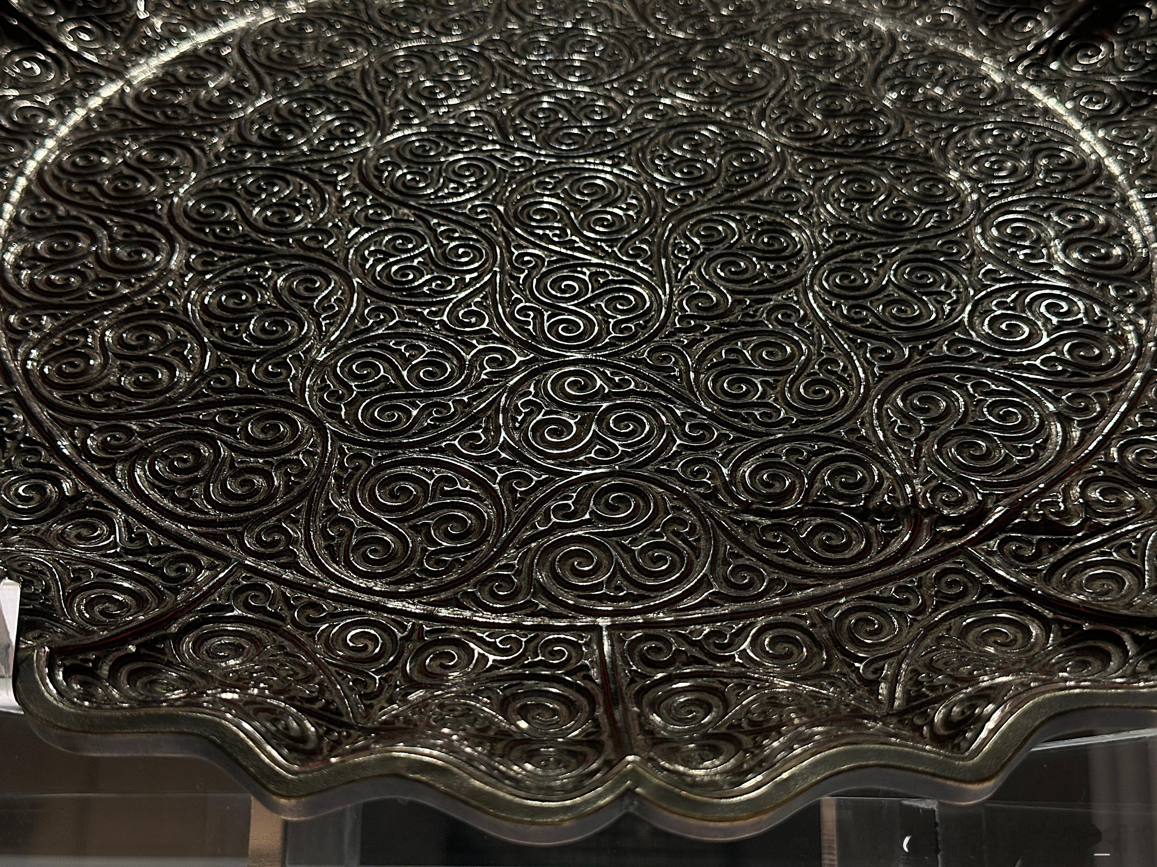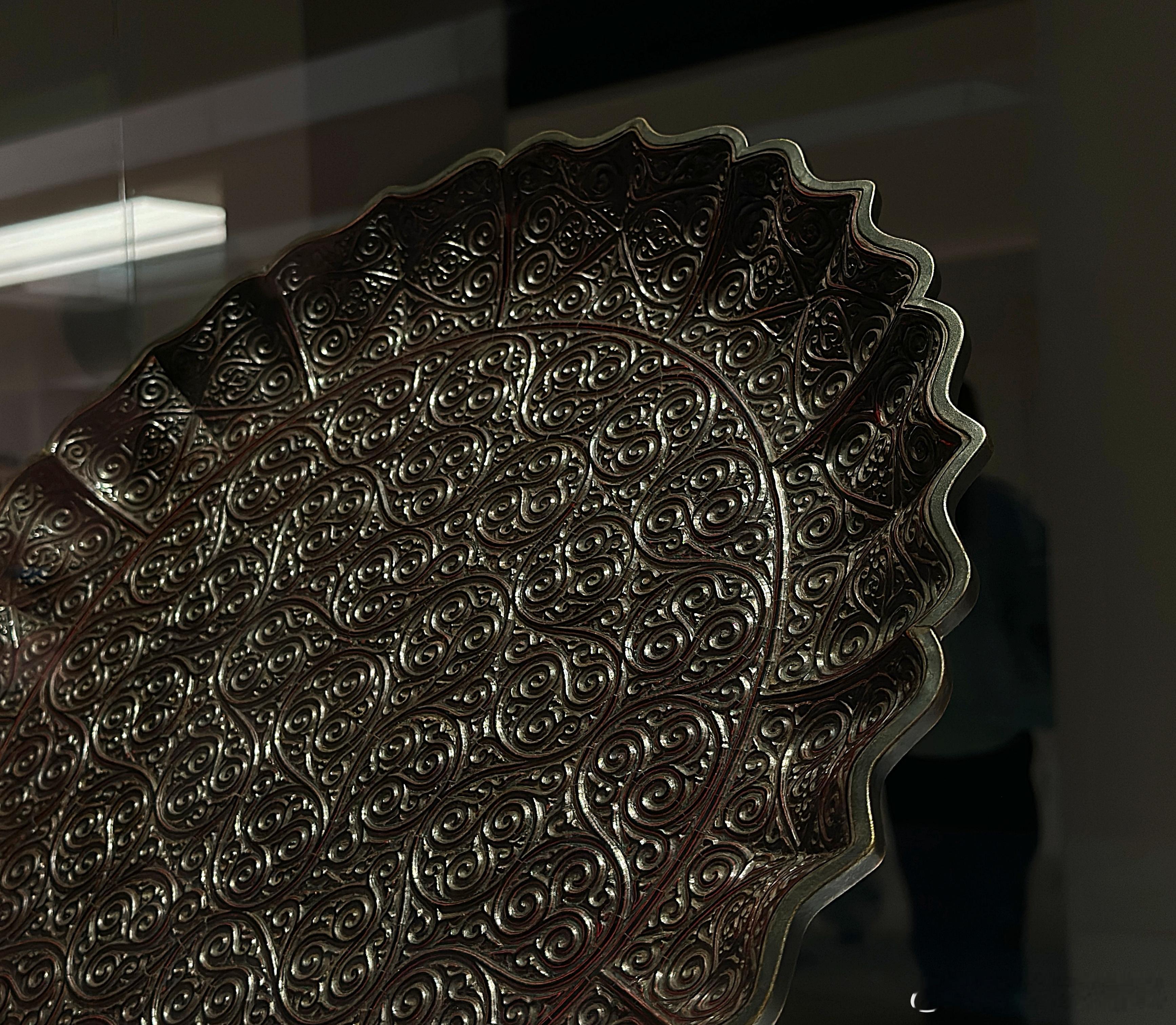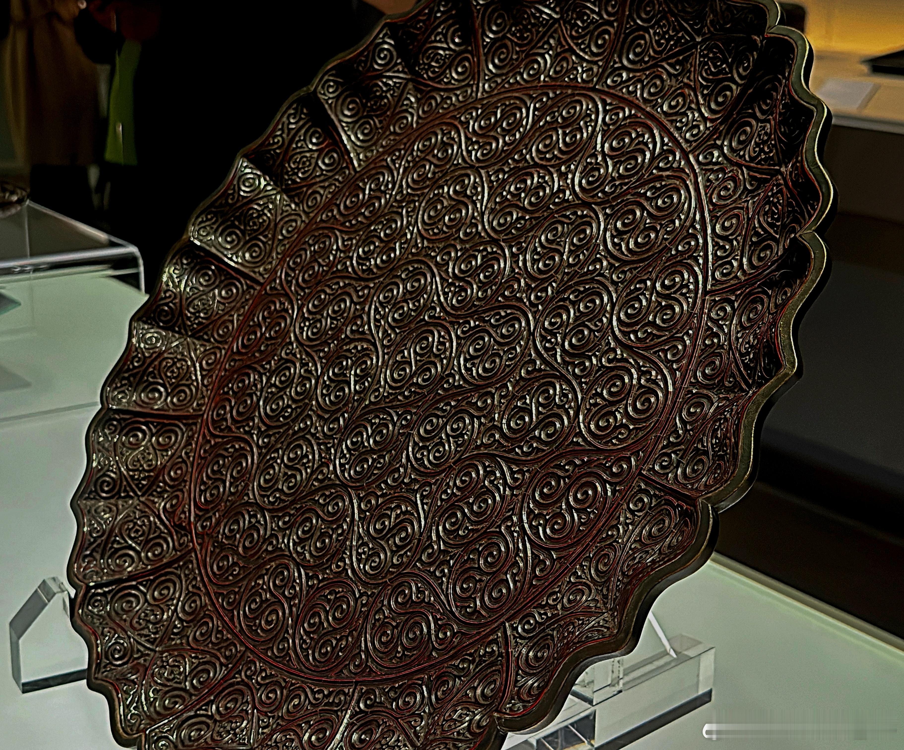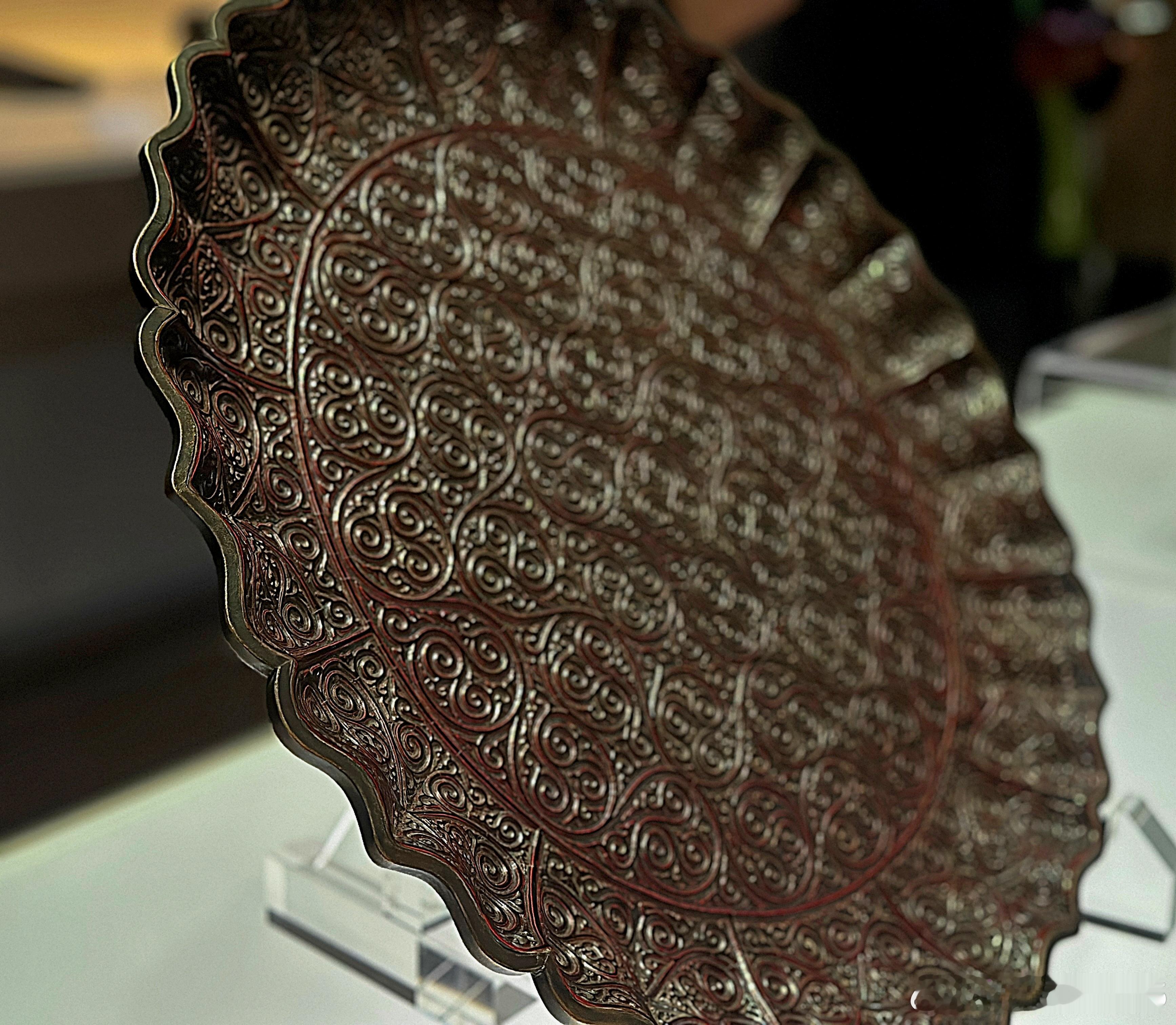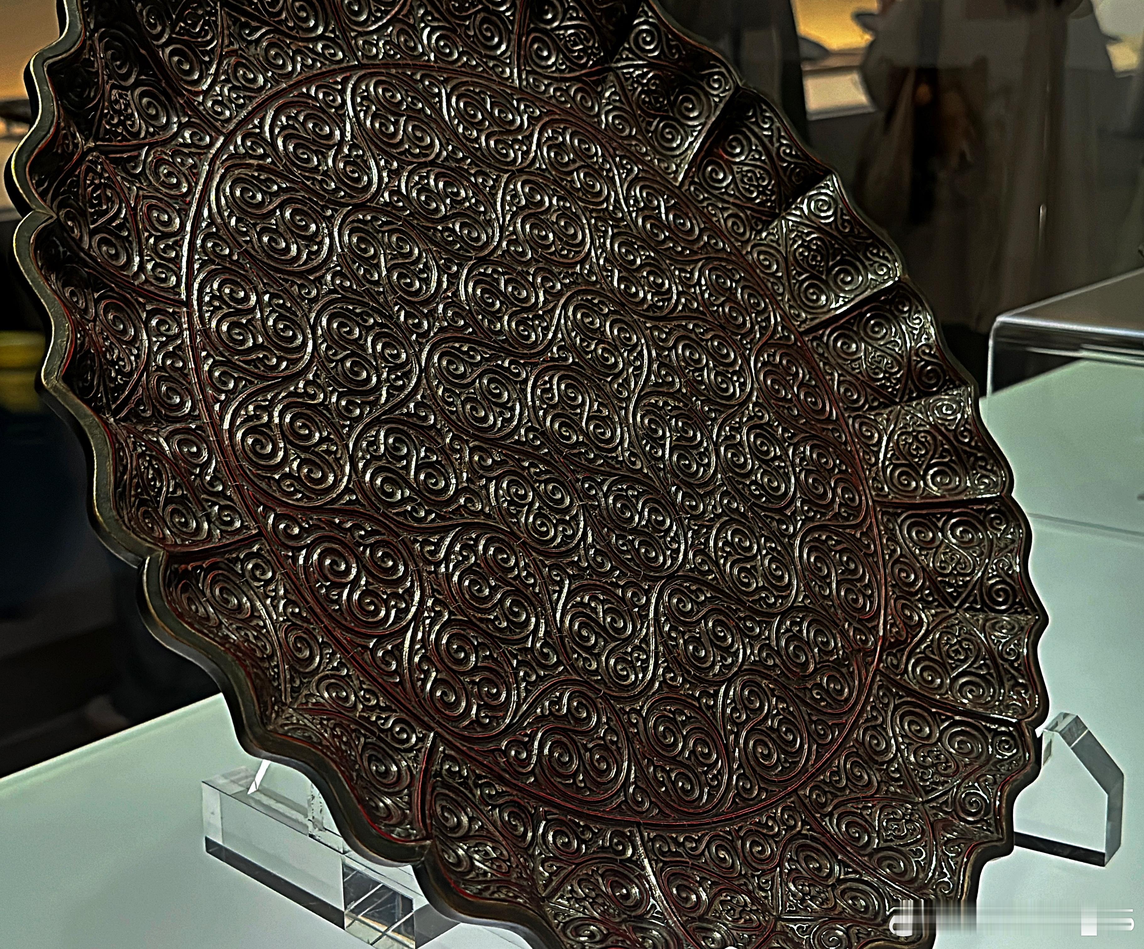 此盘造型与纹饰风格与 “南海一号”沉船出水剔犀卷草纹菱花形盘极为相似,但此盘无窄平折沿,而有黄铜扣及圆柱足。推测本盘可能受损过,黄铜扣与足可能是平折沿损毁后修补时所加。