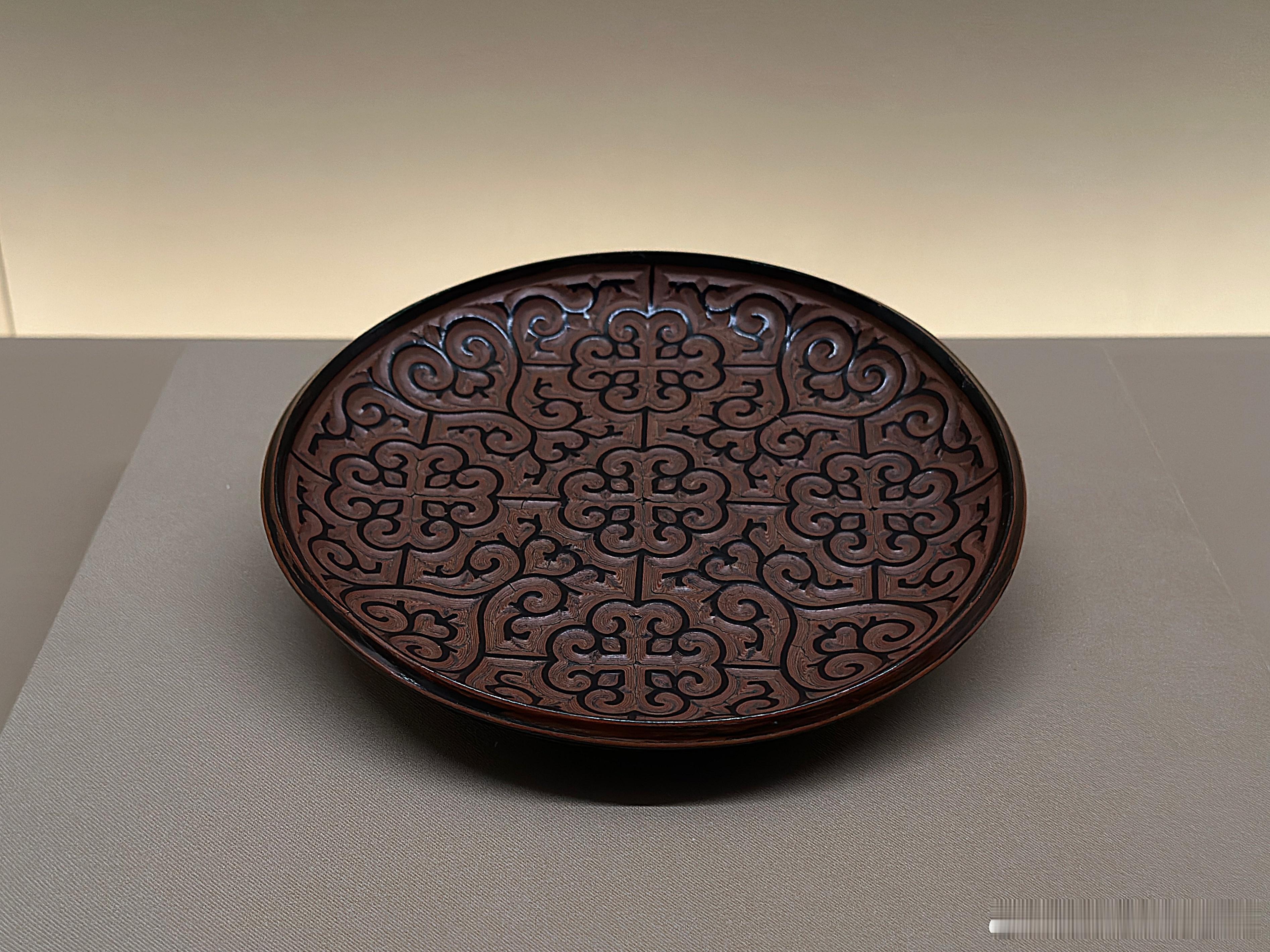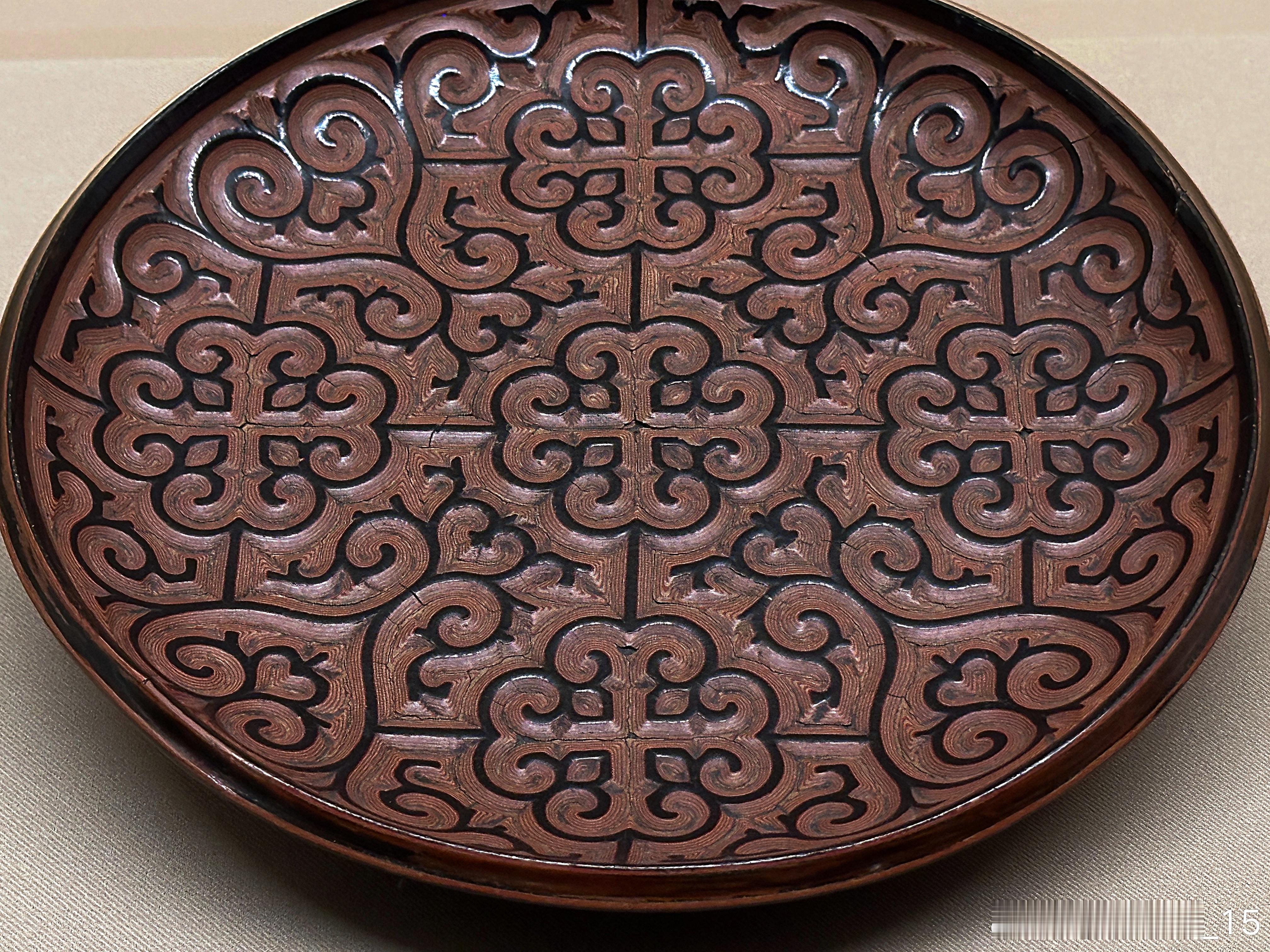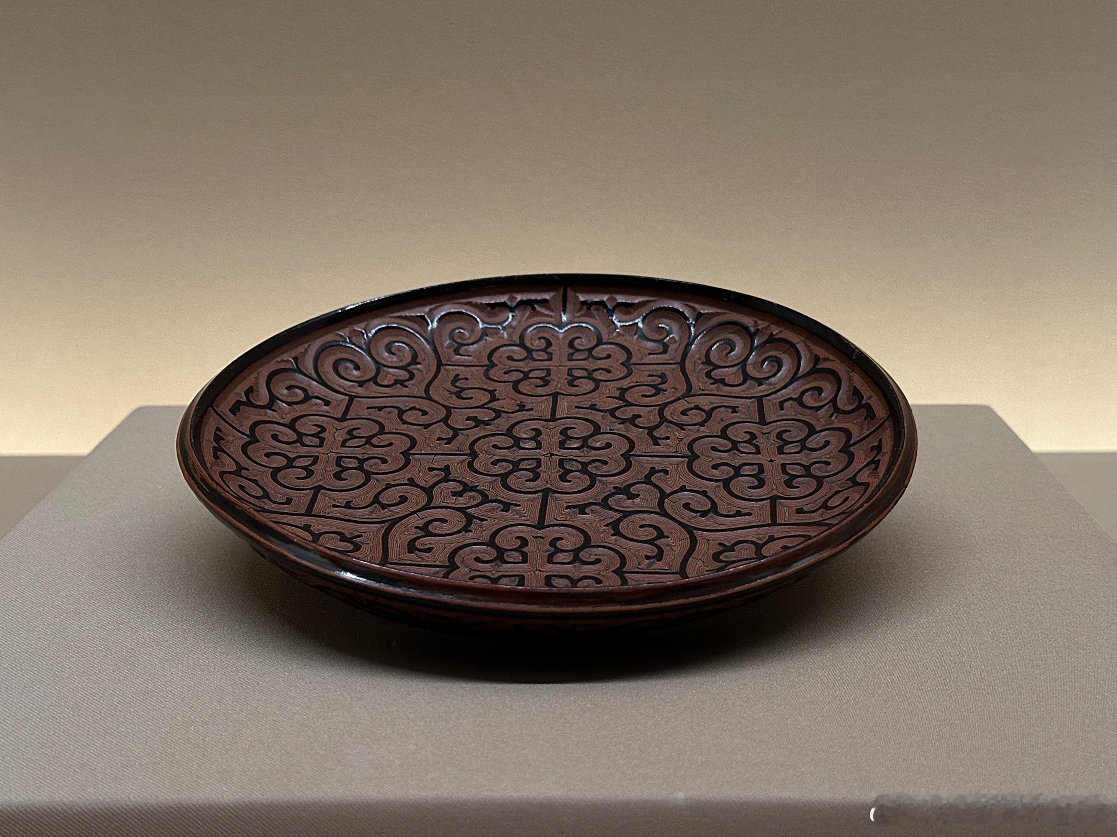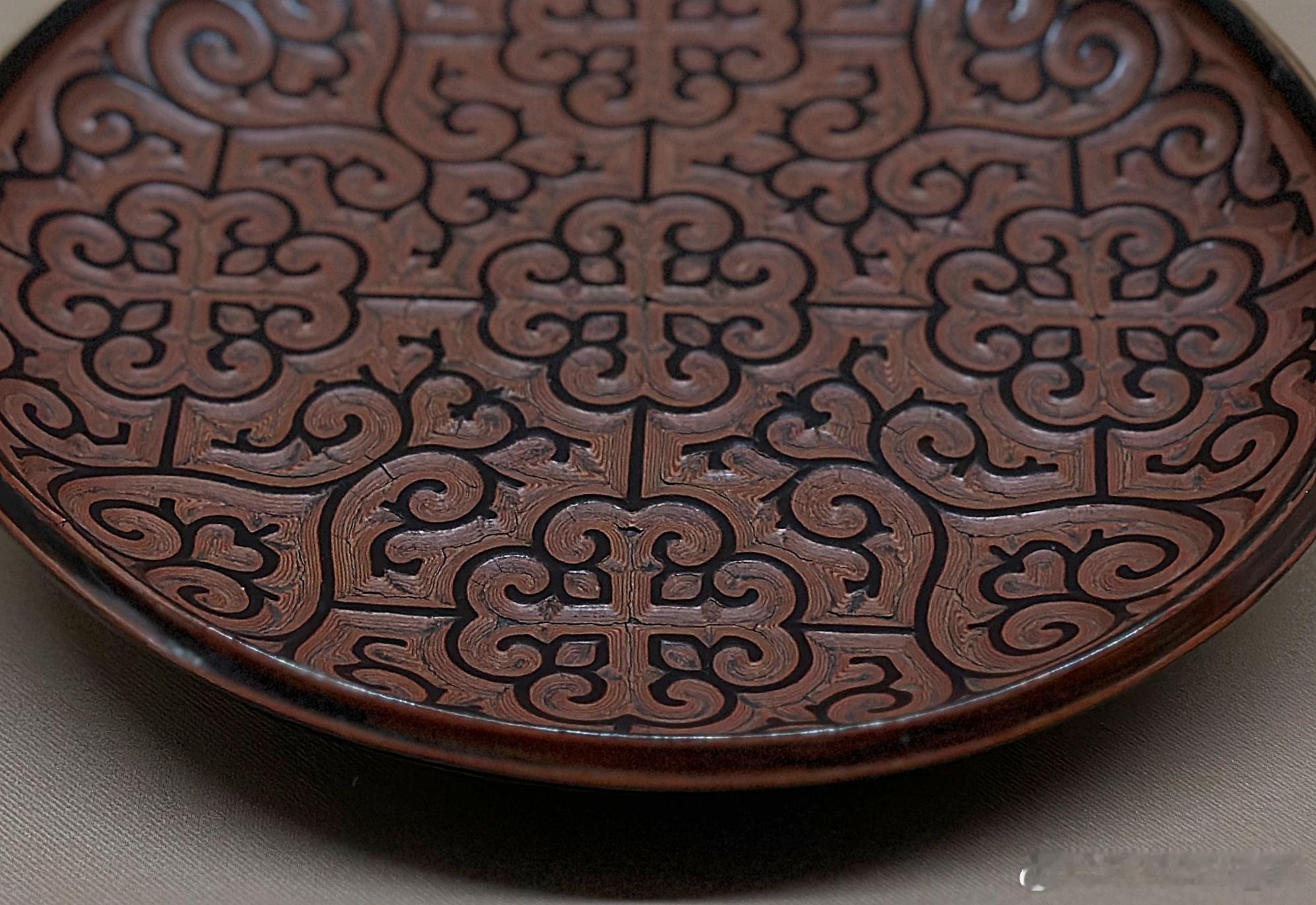 此盘面黑漆表层下朱、黄色漆相叠达十层。盘心纹饰由四组变形心形卷云龙组成,外壁刻缠枝卷草纹。纹饰以斜刀剔刻,断面显露的漆层纹饰灿然夺目,线条如行云流水,简练流畅,充分体现宋人简而雅的含蓄美。