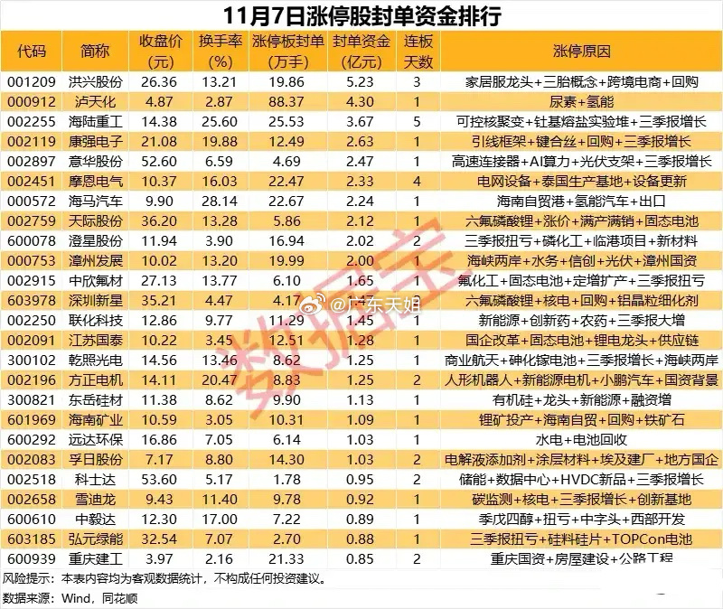 11月7日涨停股封单资金排行!涨停标的覆盖家居、能源、科技、区域政策等赛道,封单