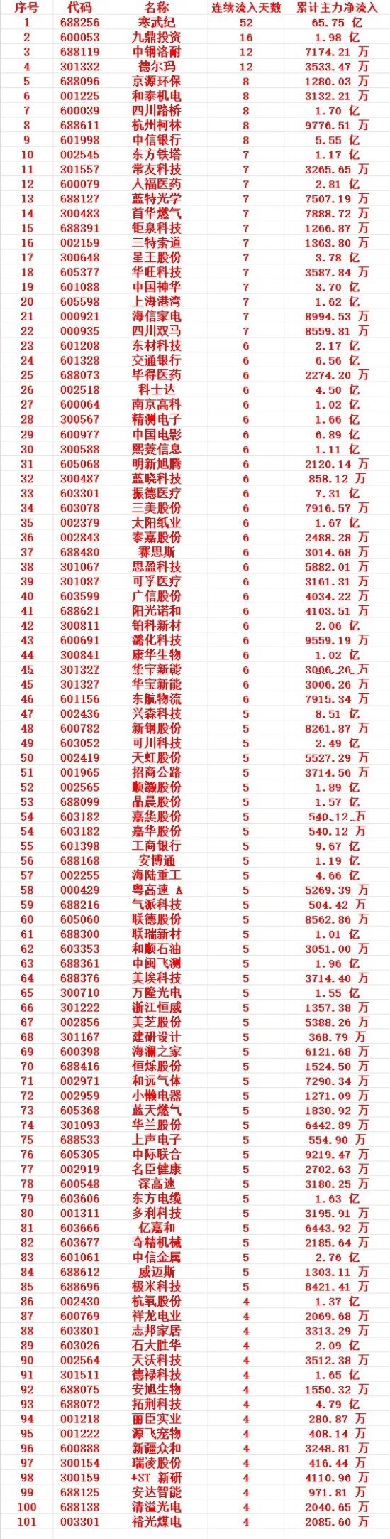 3. 行业分布广泛名单覆盖科技(寒武纪)、金融(中信银行、交通银行)、医药(人福医药)、基建(四川路桥)、消费(海信家电)等多个领域,未出现单一板块集中流入的情况,说明资金配置较为分散。