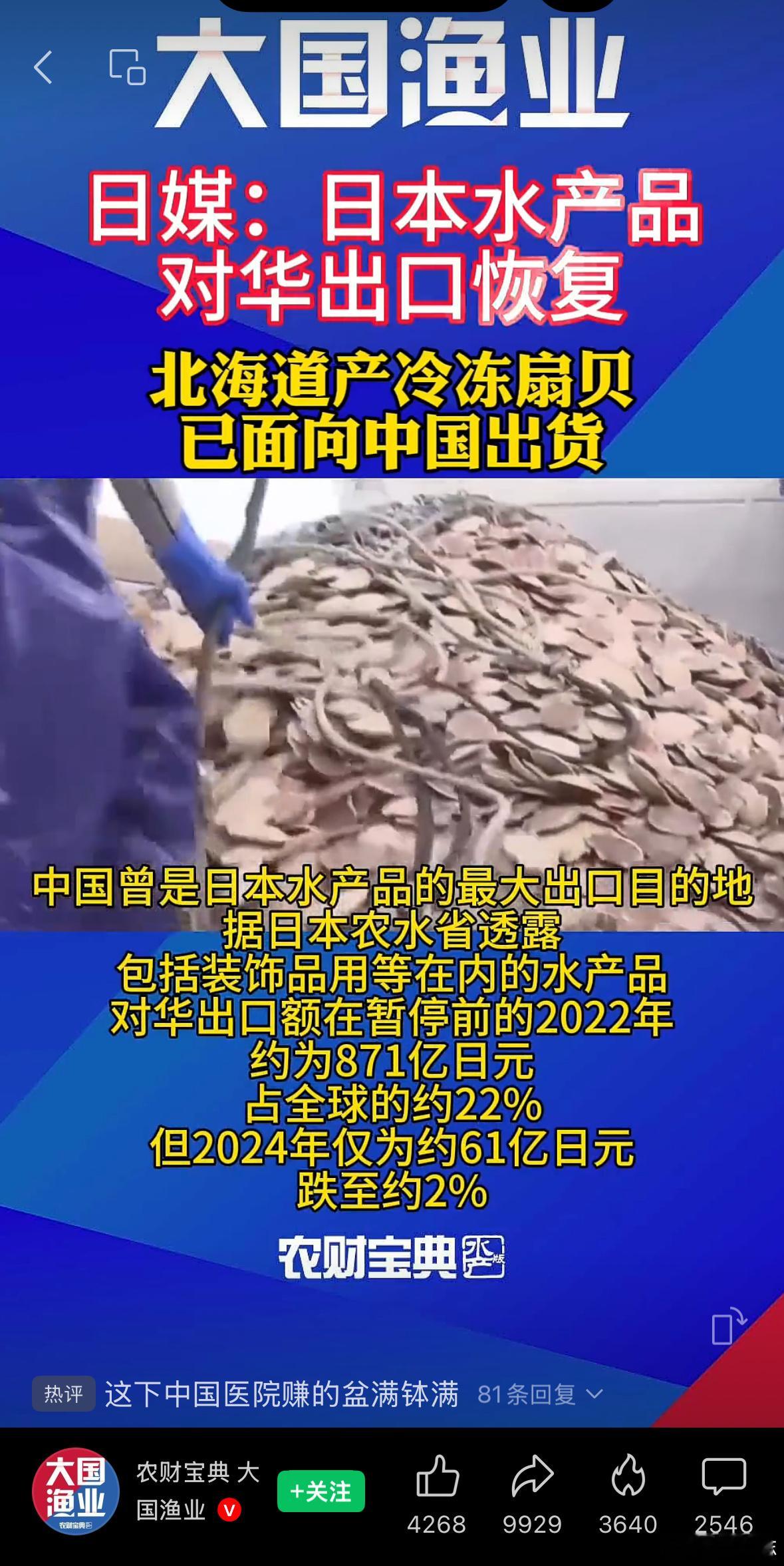 日本扇贝已出口至中国 突然一下就放开了,仿佛2022年11月。