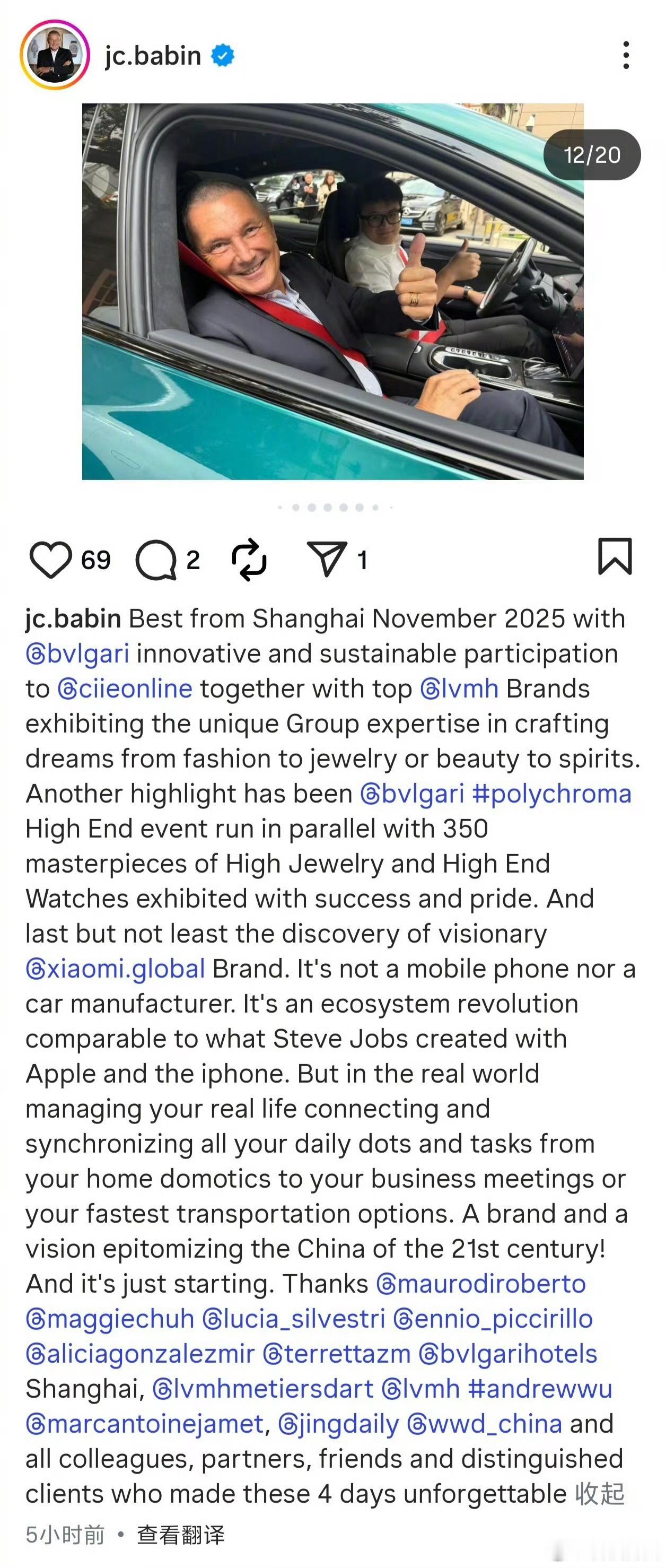 不愧是宝格丽CEO,产品做的漂亮,话说的也漂亮。逛完小米的展会说小米像当年的苹果,看来国际影响力这块小米是有了,不知道考不考虑来波联动呢。宝格丽CEO称小米成就堪比苹果