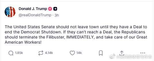 美国参议院在达成结束民主党政府停摆的协议之前不应休会。如果他们无法达成协议,共和党人应立即终止冗长辩论,并照顾好我们伟大的美国工人!