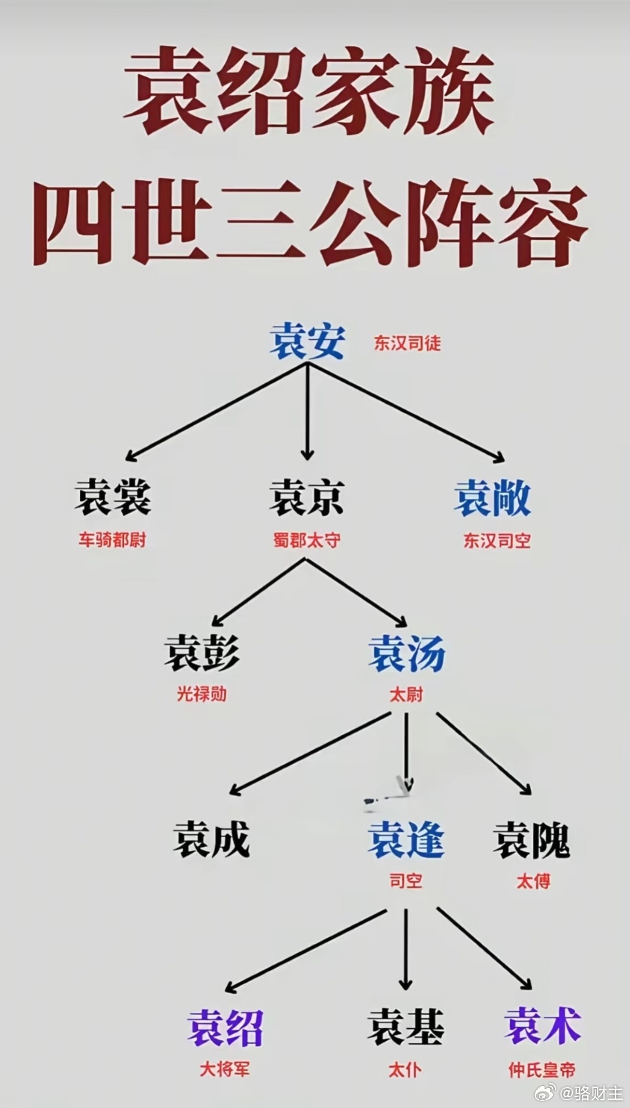 袁绍家族"四世三公"的显赫背景﹣﹣从东汉袁安开始,四代人接连担任司徒、司空、太尉等最高级别的"三公"官职,凸显其家族在东汉时期的政治权势与门阀地位,同时点明袁绍、袁术等后代依托家族影响力在汉末乱世中崛起的根基。