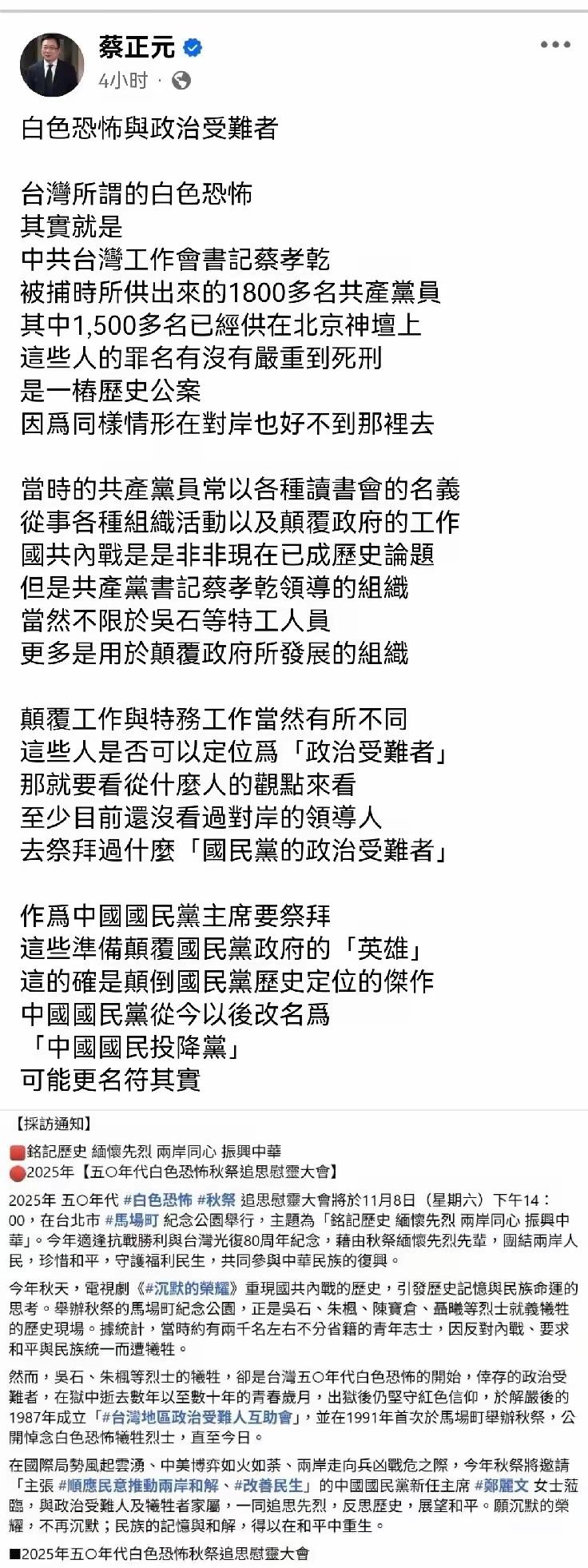 被网友认为“统派”的两大国民党员,蔡正元与邱毅,分别对郑丽文即将参加马场町纪念公园的秋祭发表看法。 邱毅力挺!觉得这与两岸统一来说,完全正确。 蔡正元批评!批评一党主席如此行径,是把国民党变成投降党。 从他们二人的态度,不难看出谁才是真统派。 邱毅一直以来都是统一的真正拥趸。 而蔡正元只能算是一个中华民族主义者,认同自己中国人的身份,也觉得要统一。但他的政治身份认同是国民党,他更从国民党的地位来发声。不然也不会觉得国民党主席如此行径是投降行为,直言中国国民党改名为中国国民投降党更贴切。 两人迥异的态度,揭示了哪怕是国民党内“统派”之间的深刻差异。 邱毅的立场更侧重于民族整体的和解与统一大局,超越了党派之争,坚定拥护两岸大一统。 而蔡正元的反应,则站在国民党的立场上,维护国民党的利益,但这格局就显小了。国民党自内战之后,败走台湾。其于中国的政治影响力再也无法达到民国时期了。试问,如果将来统一,国民党结局还有别的可能吗?要么投诚,要么投降。没有其他可能了。正因如此,蔡正元的统一就不如邱毅纯粹,难以完全超越一党一派的框架定位。