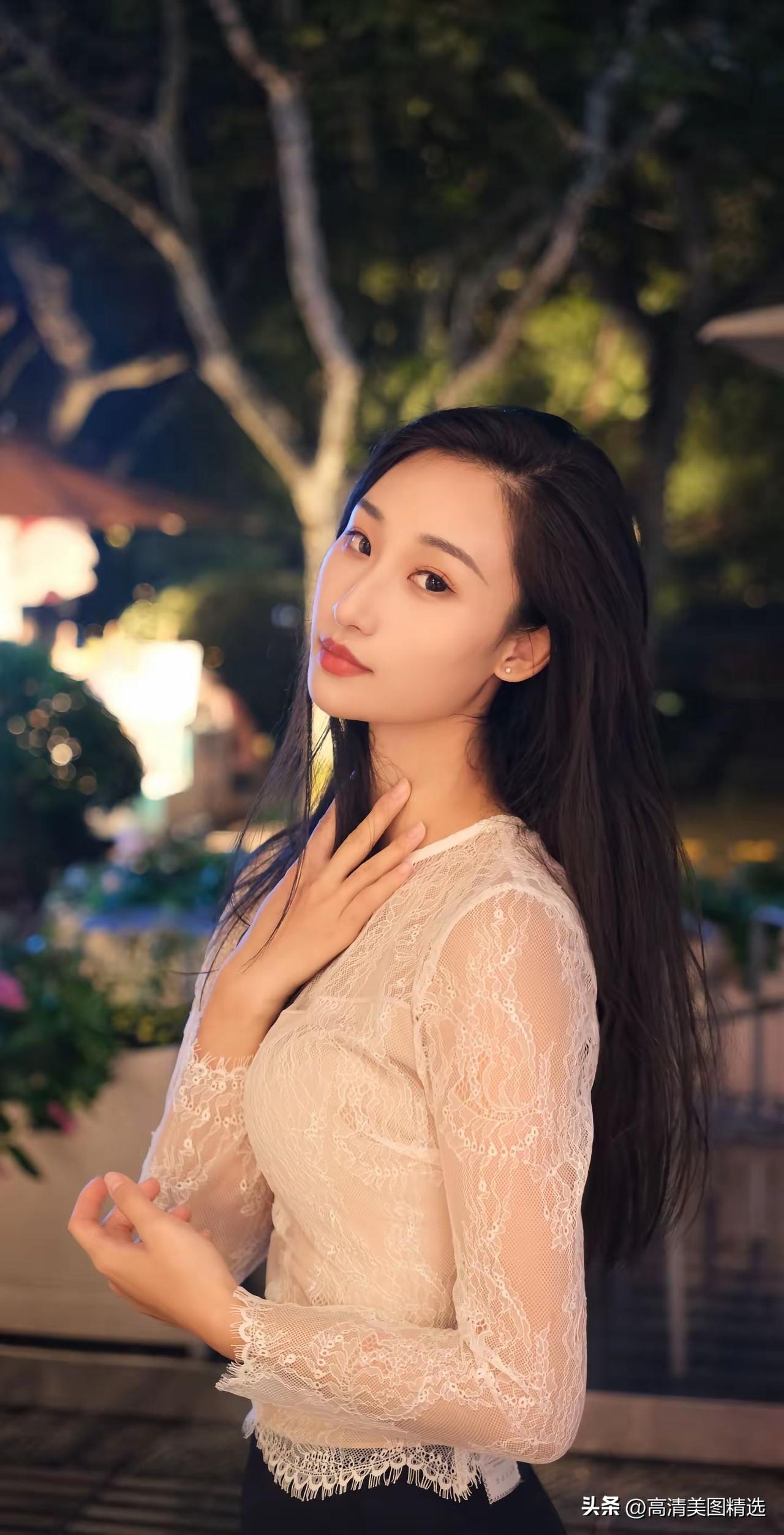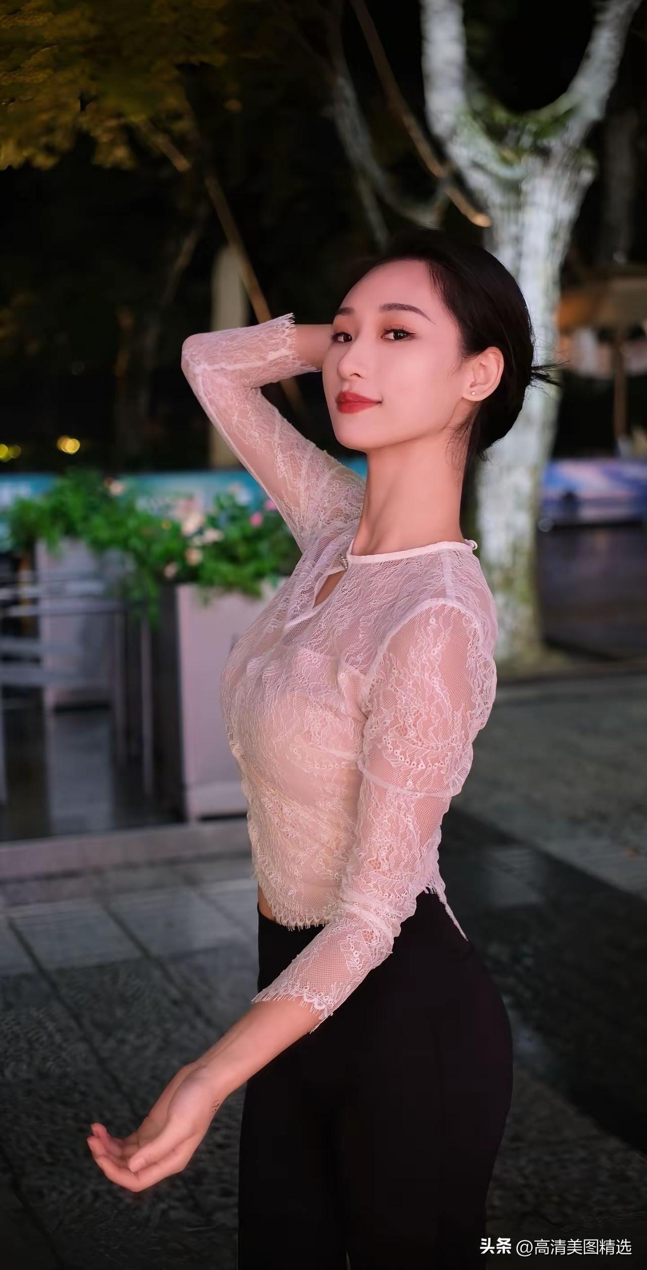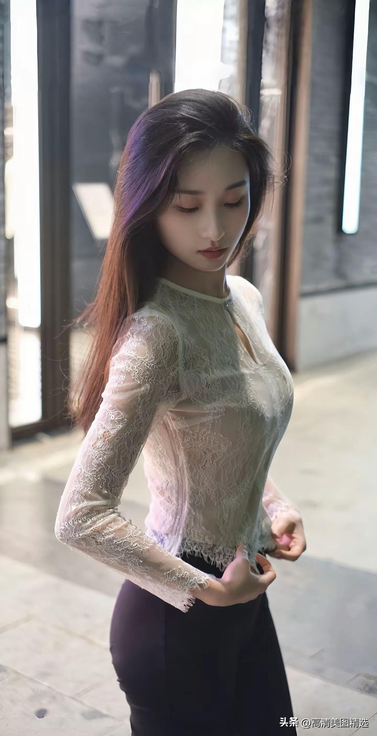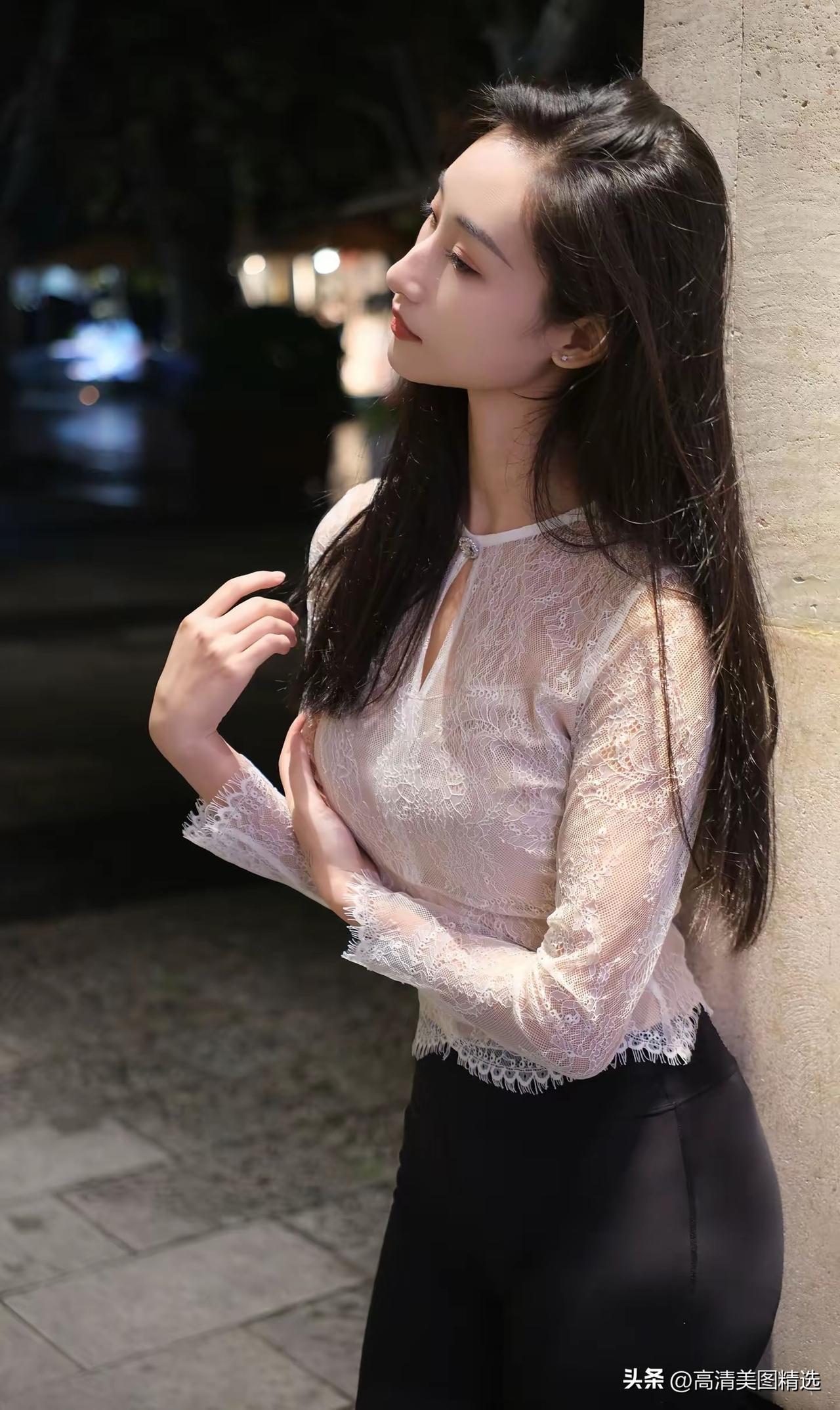 这位女士穿着蕾丝长袖裙,看起来很漂亮。