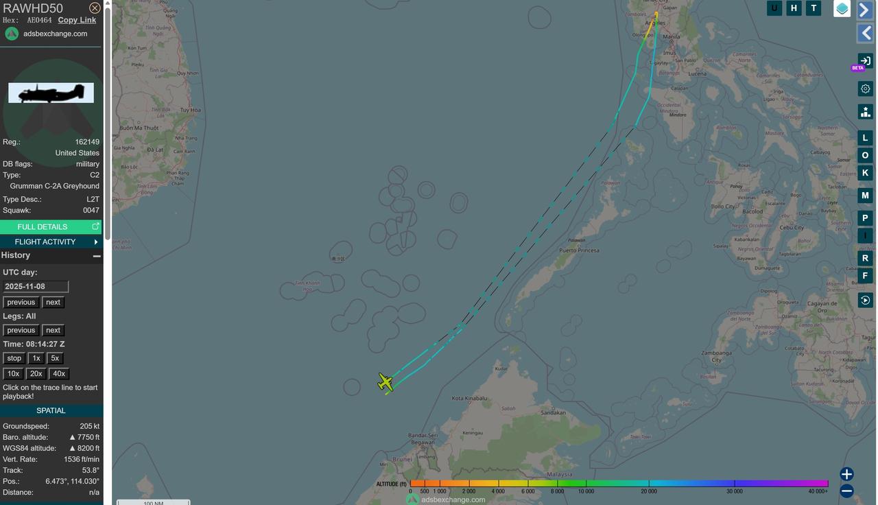 11月8号,C-2A“灰狗”舰载运输机的飞行活动显示,美国海军尼米兹号航母(CVN-68)已经移动至南沙群岛南通礁附近海域。
