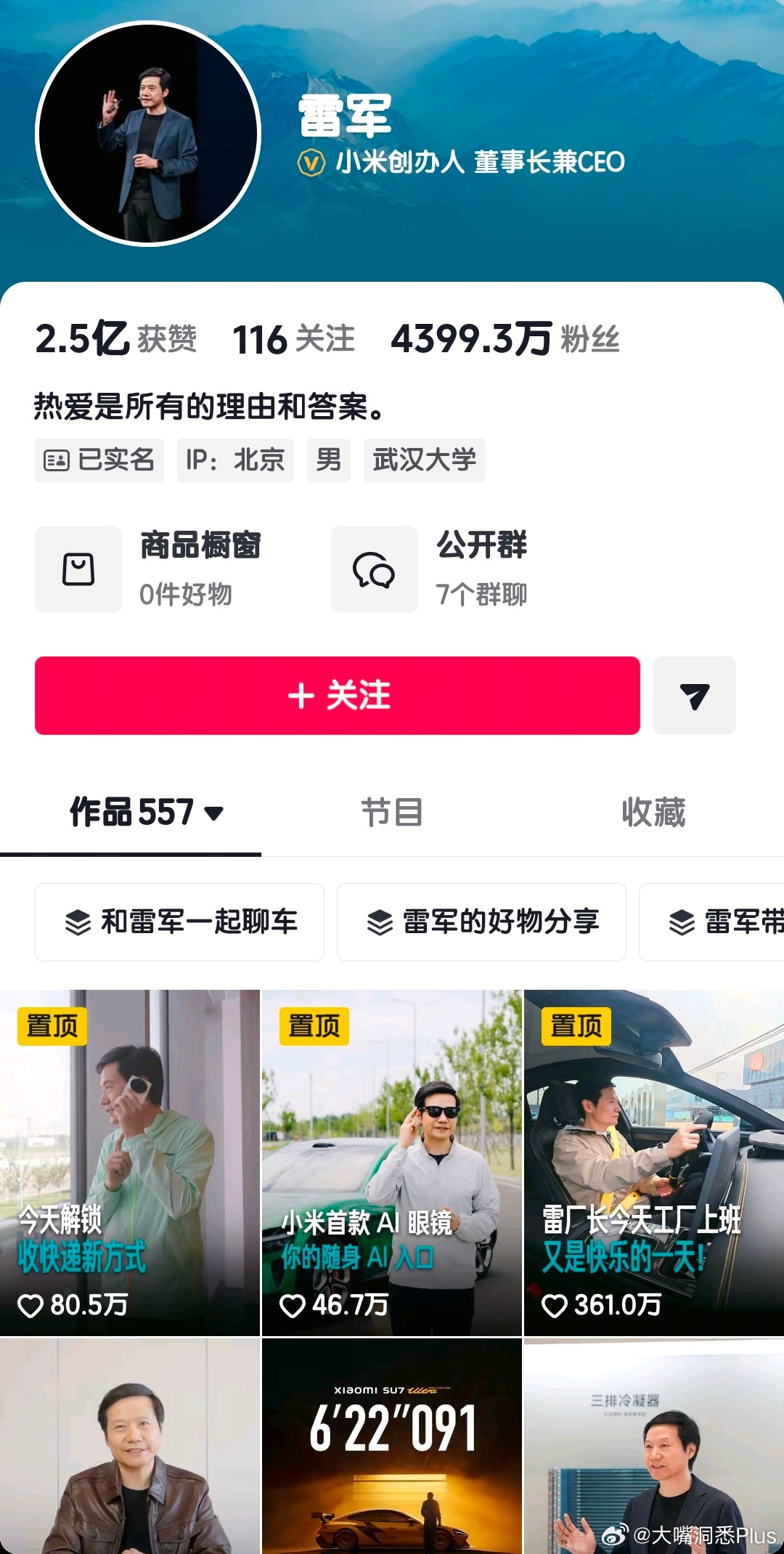 雷军的粉丝持续下滑,今天跌破4400万关口,来到了4399.3万