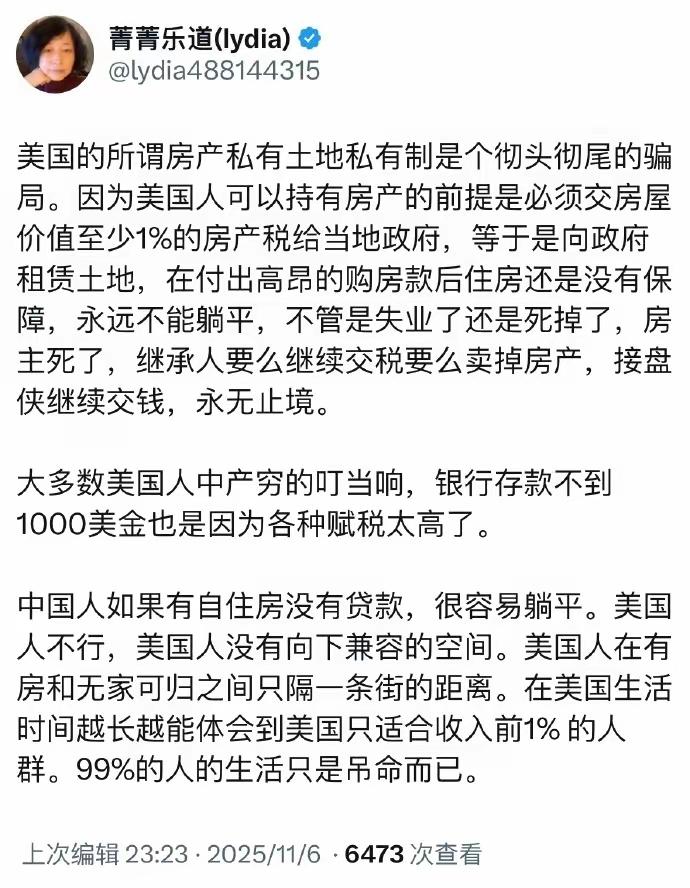 早就知道是这样的:在美国,有钱人的生活上限高;在中国,普通老百姓的生活底线高。 对于那些精于算计的人来说,选择中国还是选择美国,这就只是是一个利益衡量算账的问题。 所以,中国的普通老百姓就不要去幻想在美国的幸福生活了,除了能帮助移民中介完成KPI以外,什么也得不到。 当然,你要是一个亿万富翁,那么你在这个世界任何地方都会有很好的生活。美国也不是唯一选择。 点右上角关注我,我们一起去看这个魔幻的世界